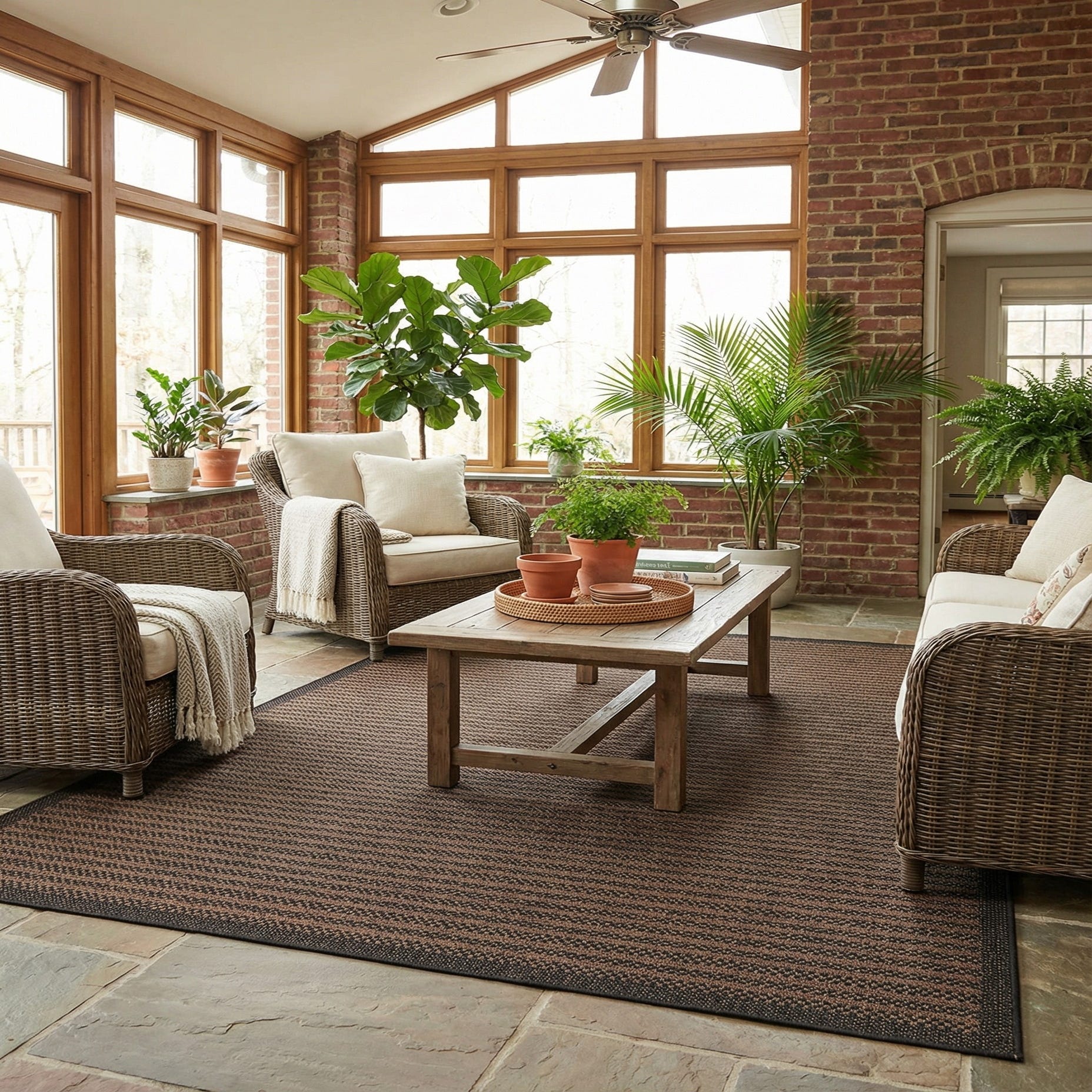 Primary color is Brown. Colors in this rug include: Brown, Black.
