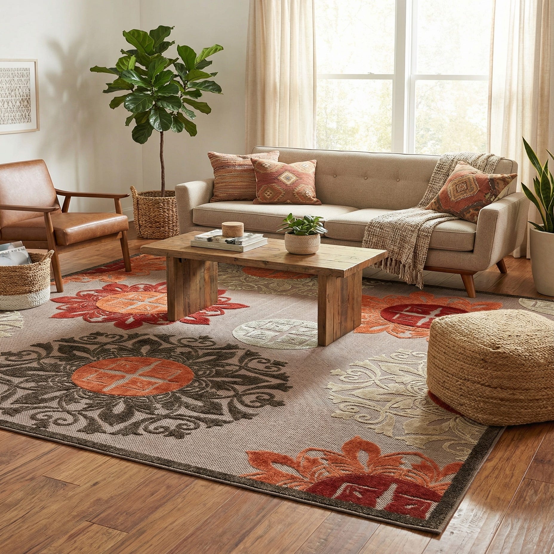 Primary color is Brown. Colors in this rug include: Brown, Beige, Gray, Orange, Red.