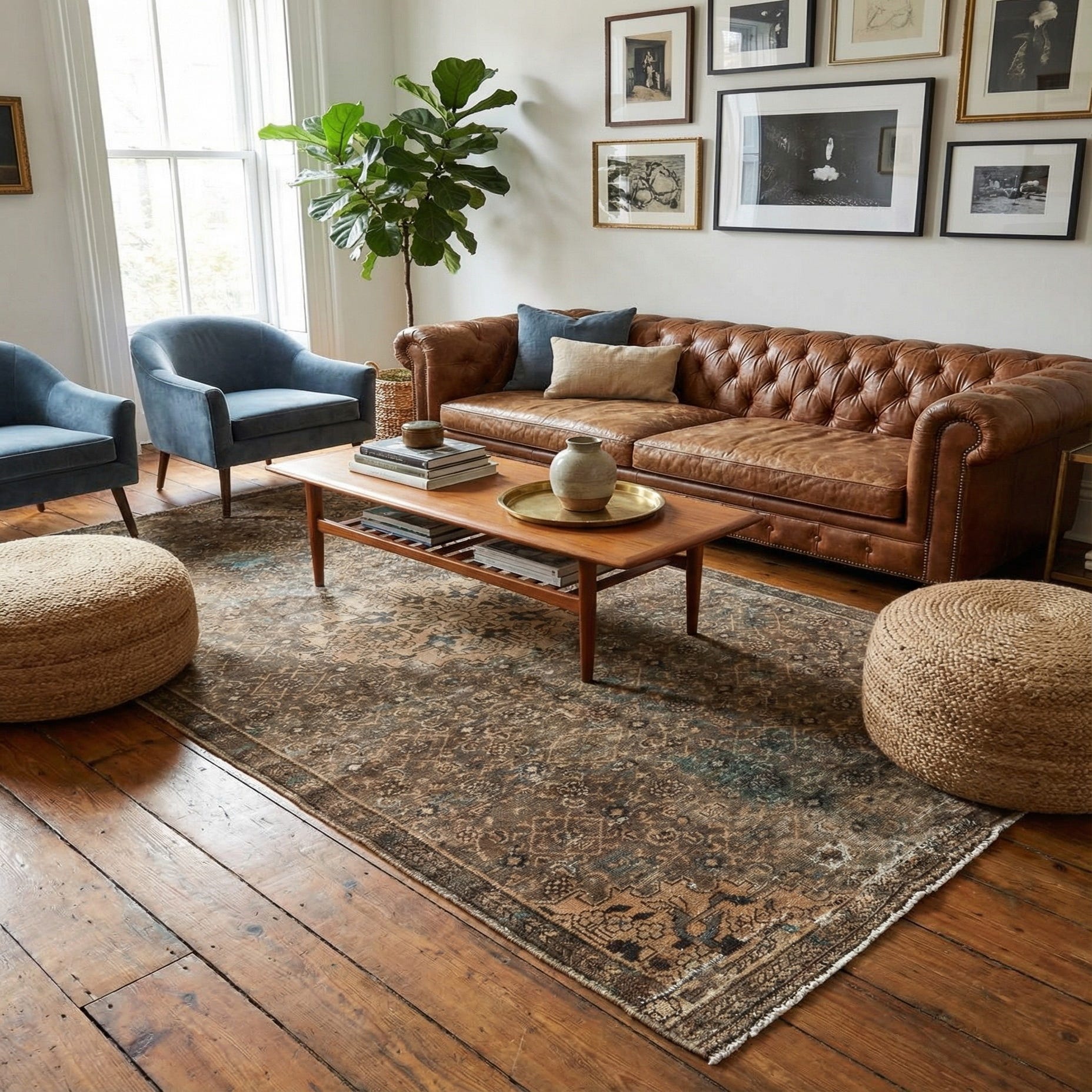 Primary color is Brown. Colors in this rug include: Brown, Beige, Light Brown, Navy Blue, Rust Red.