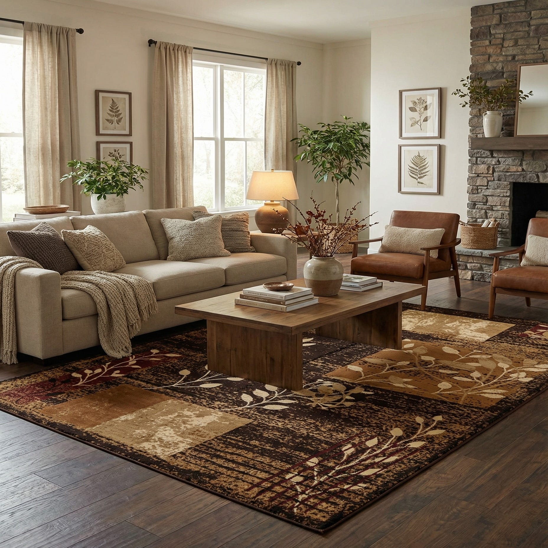 Primary color is Brown. Colors in this rug include: Brown, Beige, Cream, Light Brown, Burgundy, Maroon.