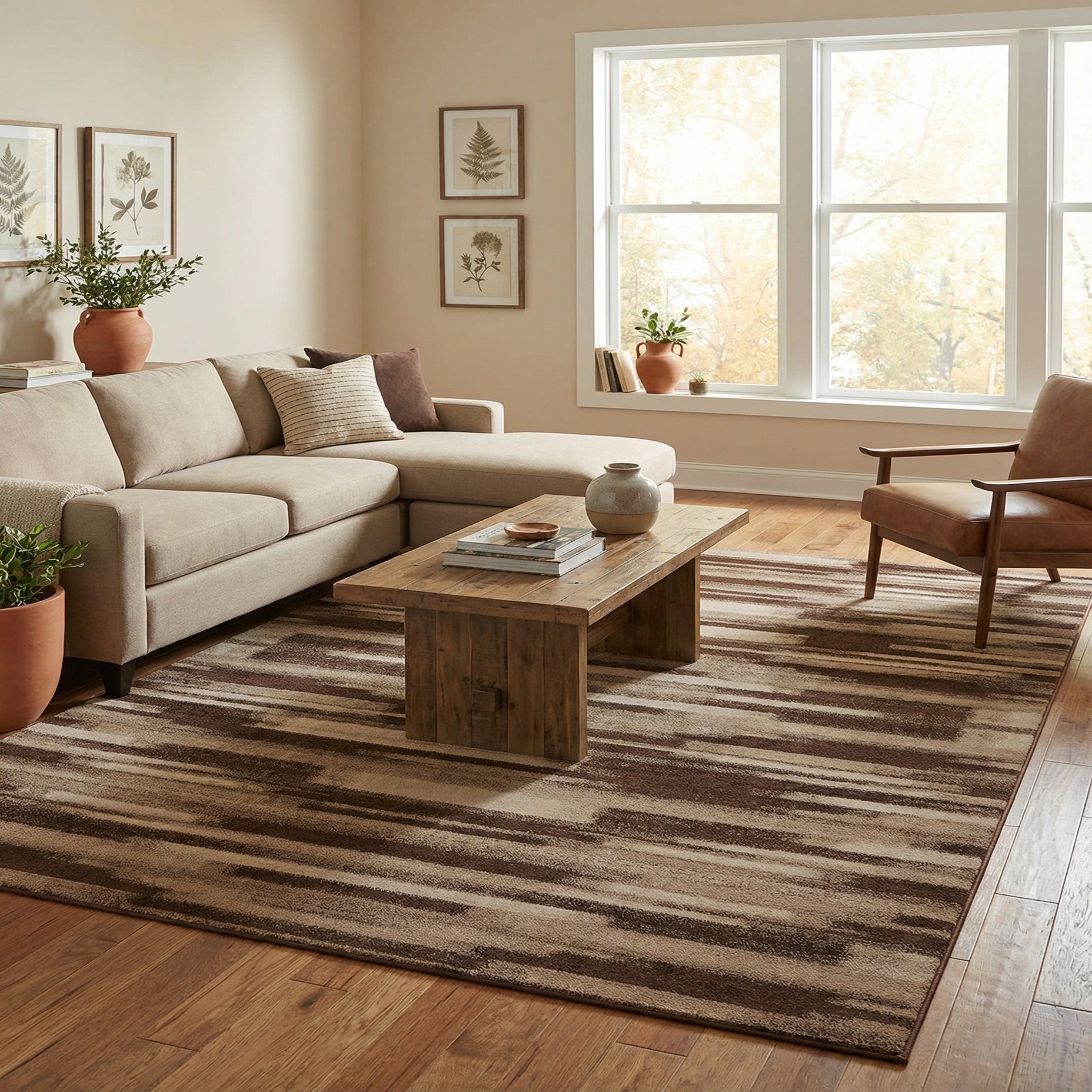 Primary color is Brown. Colors in this rug include: Brown, Beige, Light Brown.