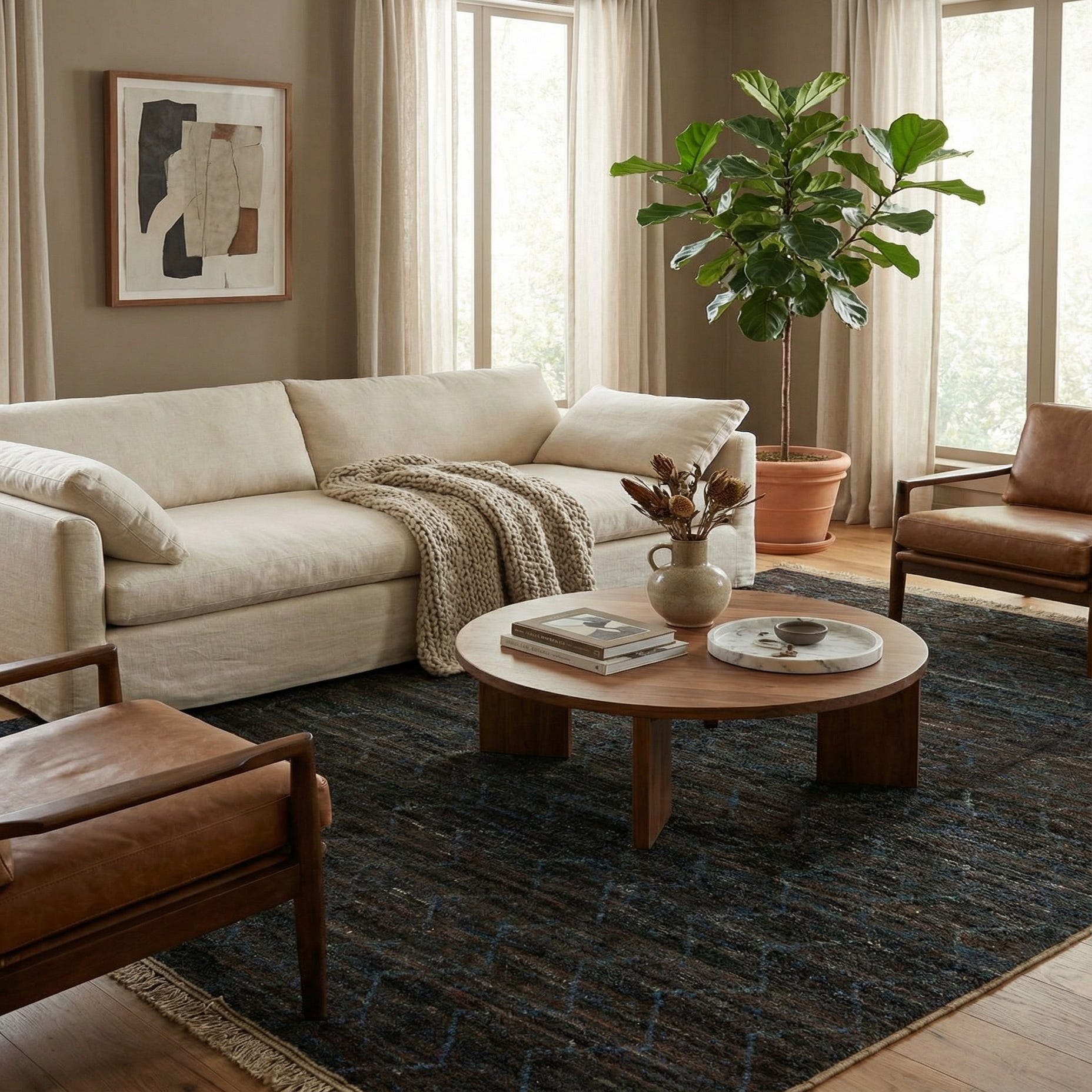 Primary color is Brown. Colors in this rug include: Brown, Beige, Gray, Blue.