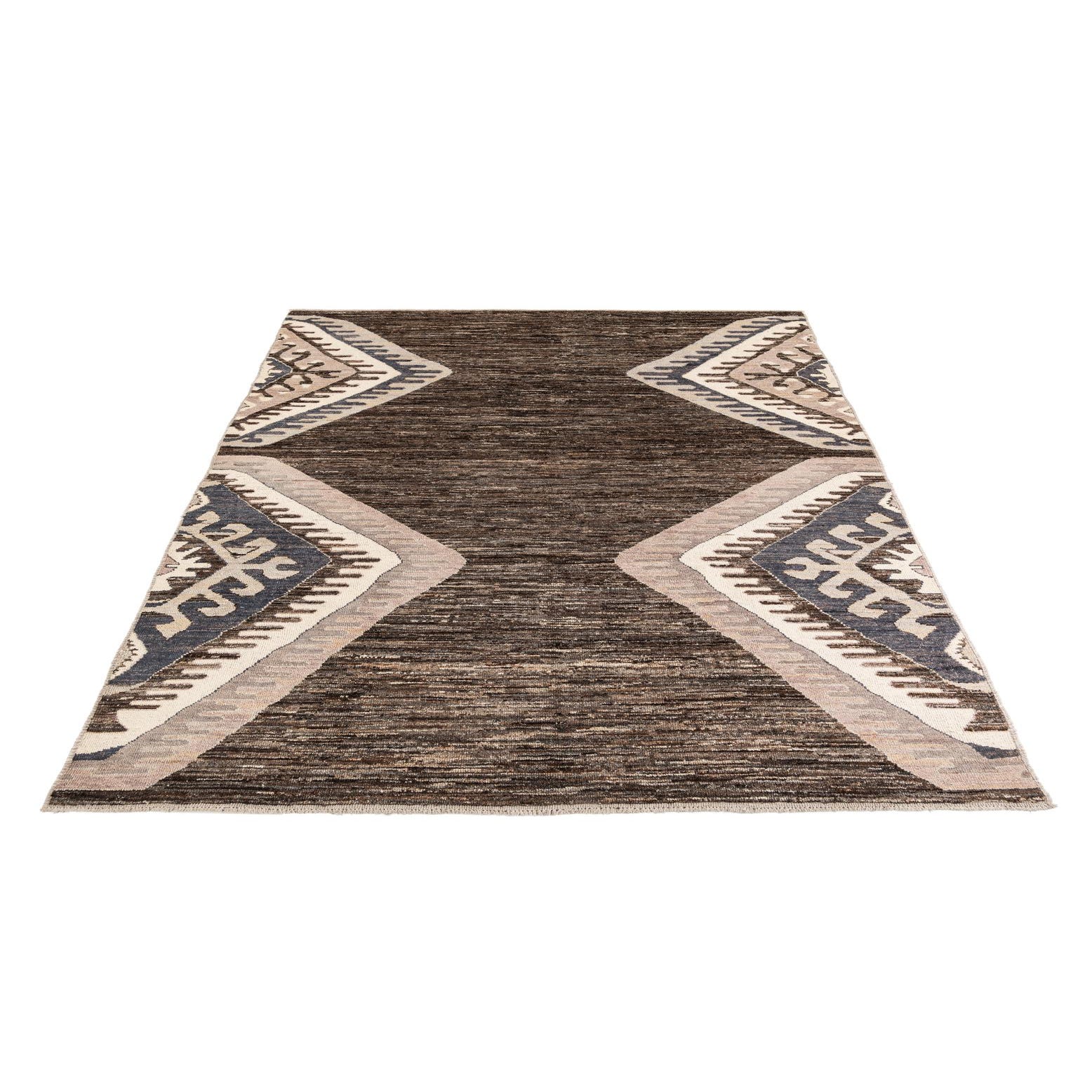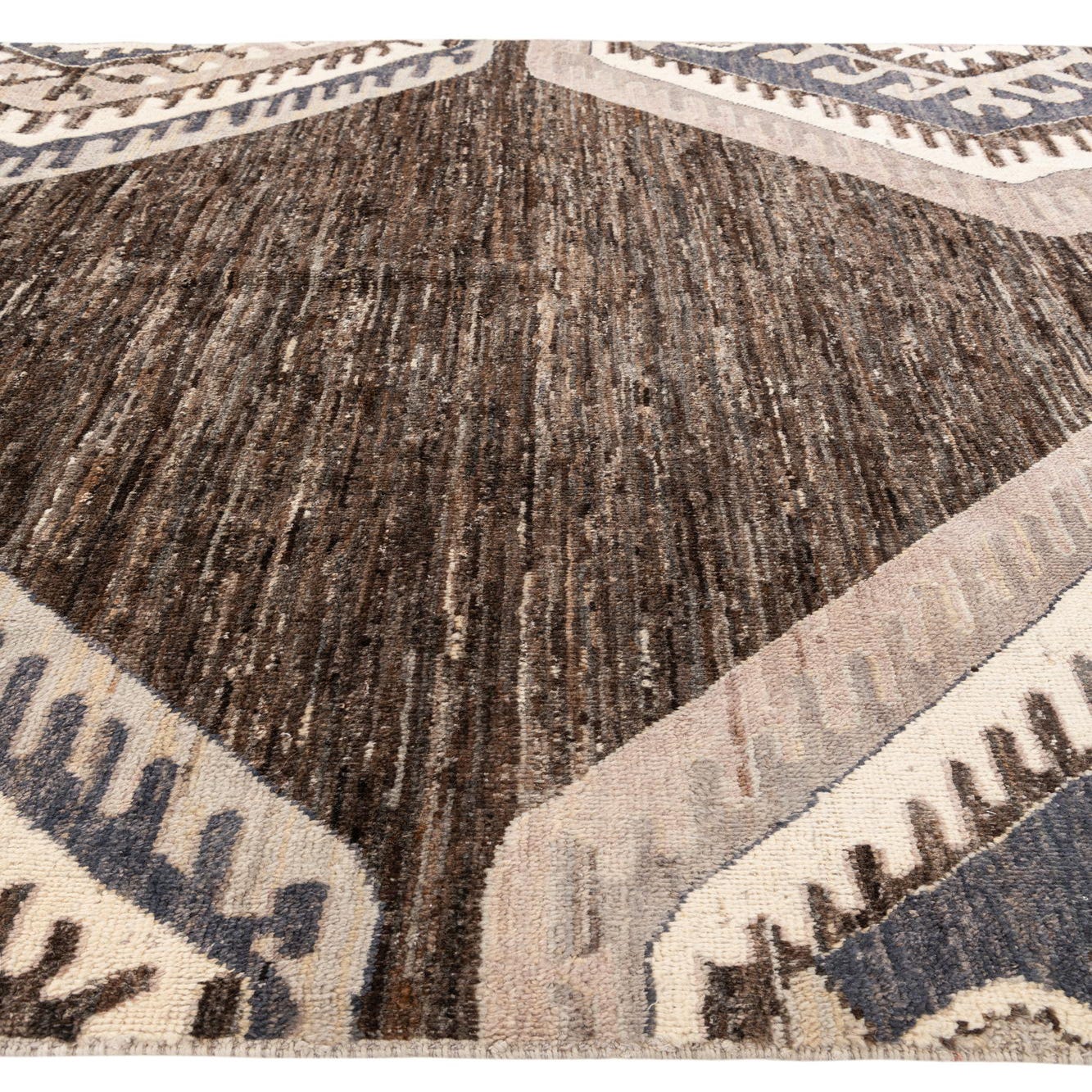 Primary color is Brown. Colors in this rug include: Brown, Gray, Ivory, Navy Blue, Light Brown.