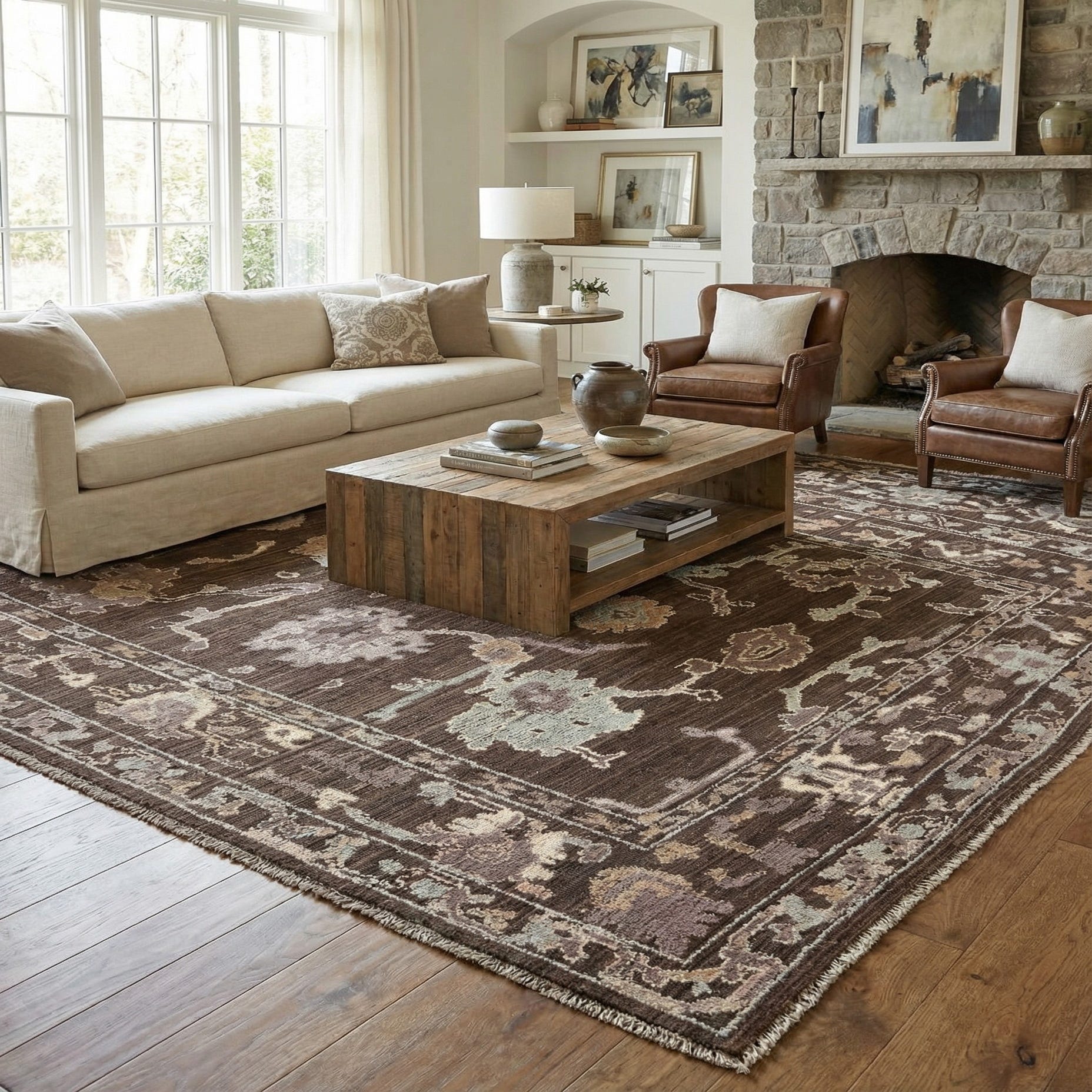Primary color is Brown. Colors in this rug include: Brown, Gray, Ivory, Tan, Light Green, Light Brown.
