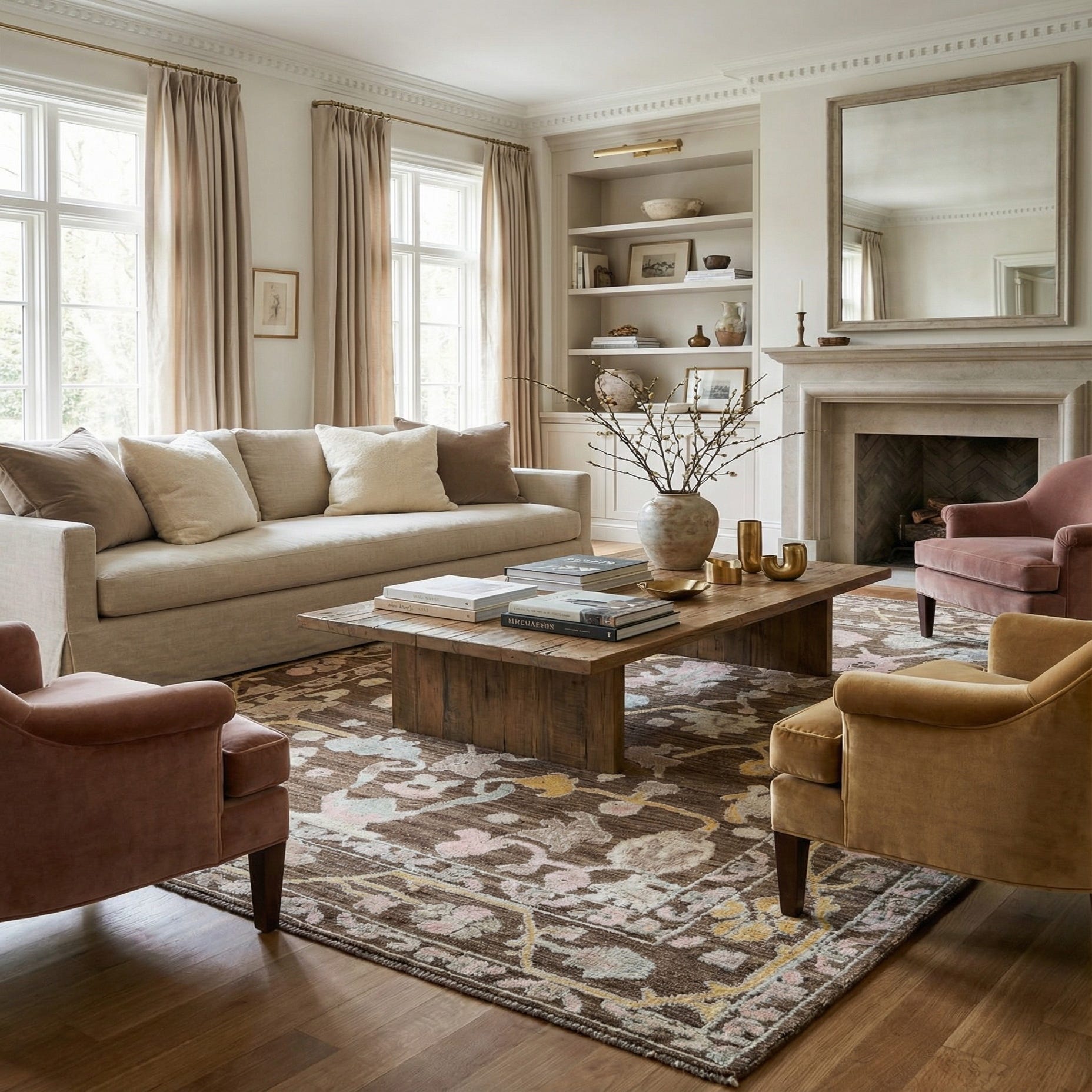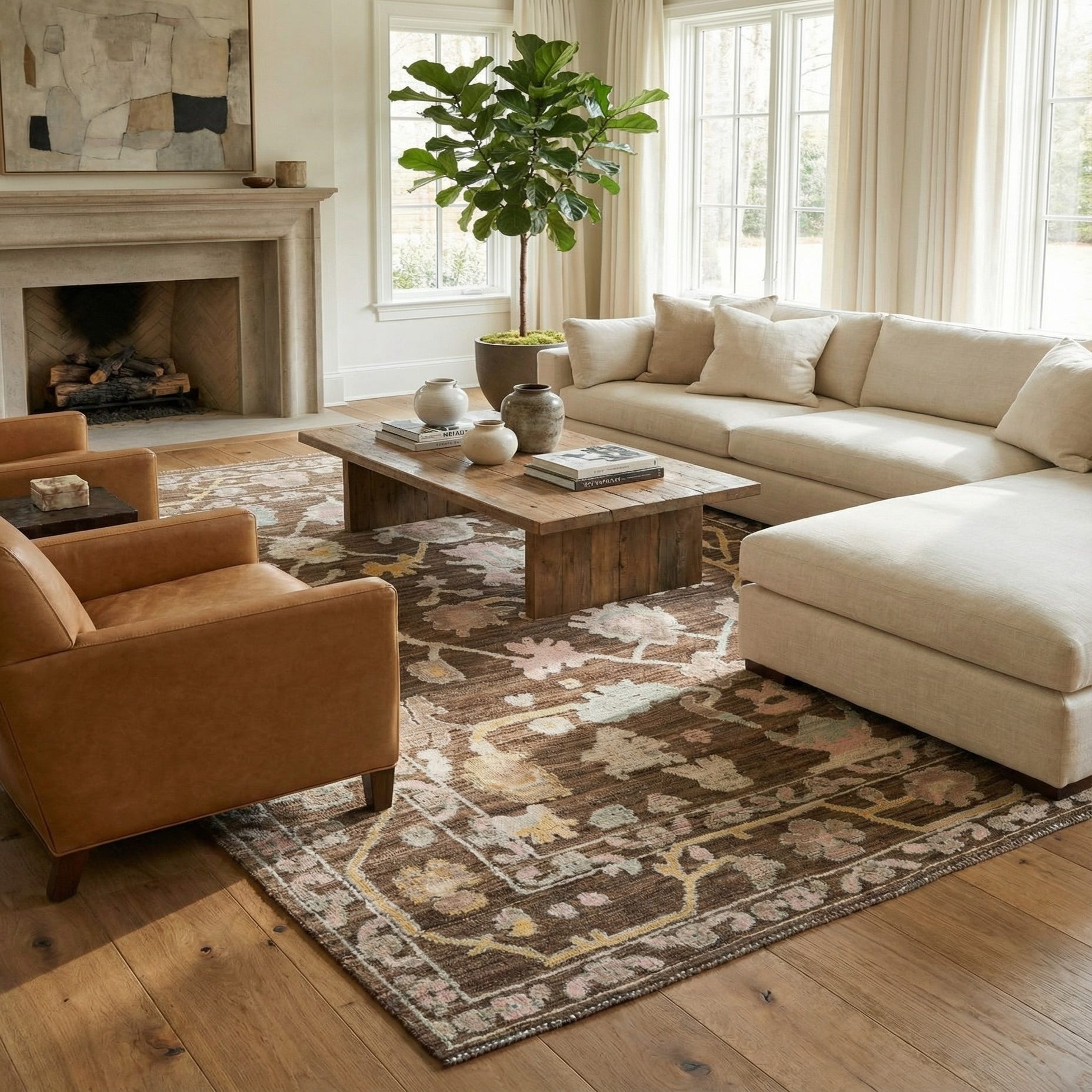 Primary color is Brown. Colors in this rug include: Brown, Light Blue, Yellow, Pink, Ivory, Light Brown.