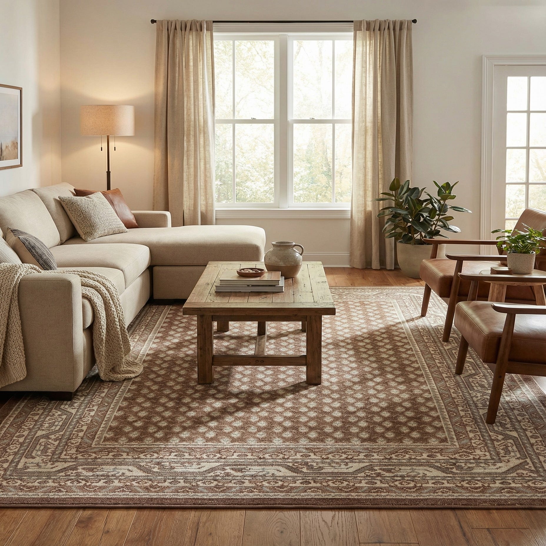 Primary color is Brown. Colors in this rug include: Brown, Beige, Gray.