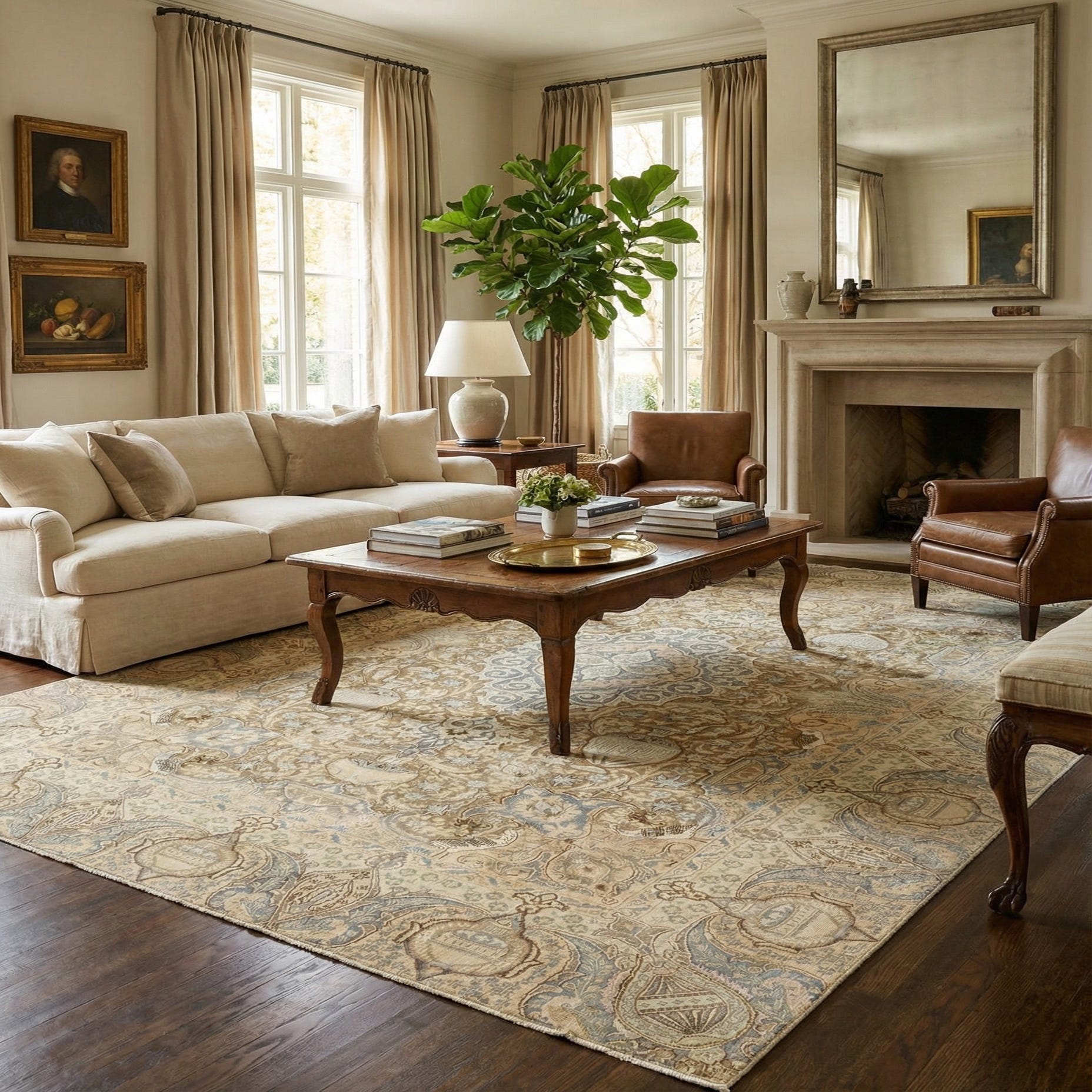 Primary color is Brown. Colors in this rug include: Brown, Beige, Blue, Cream, Gray, Green, Tan.