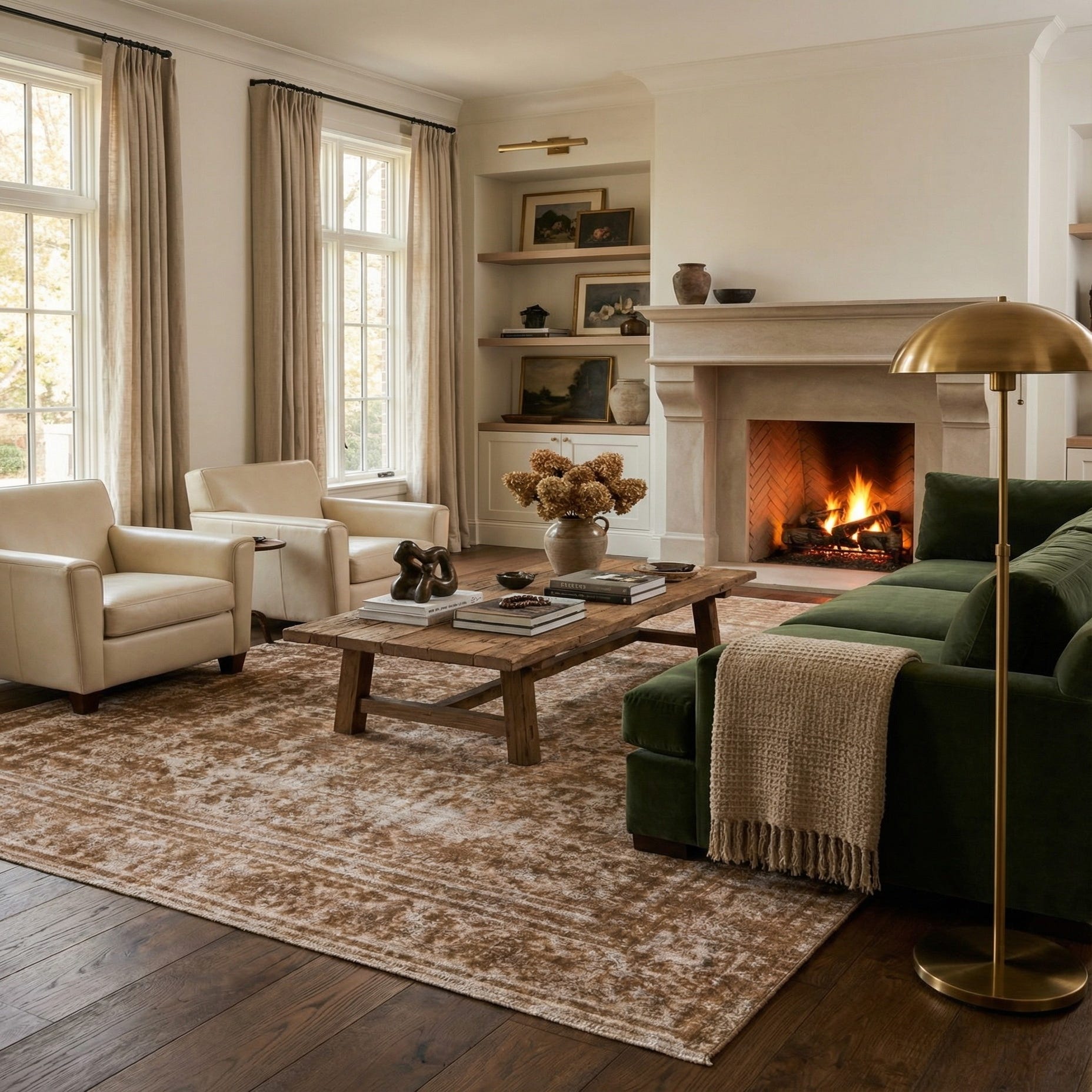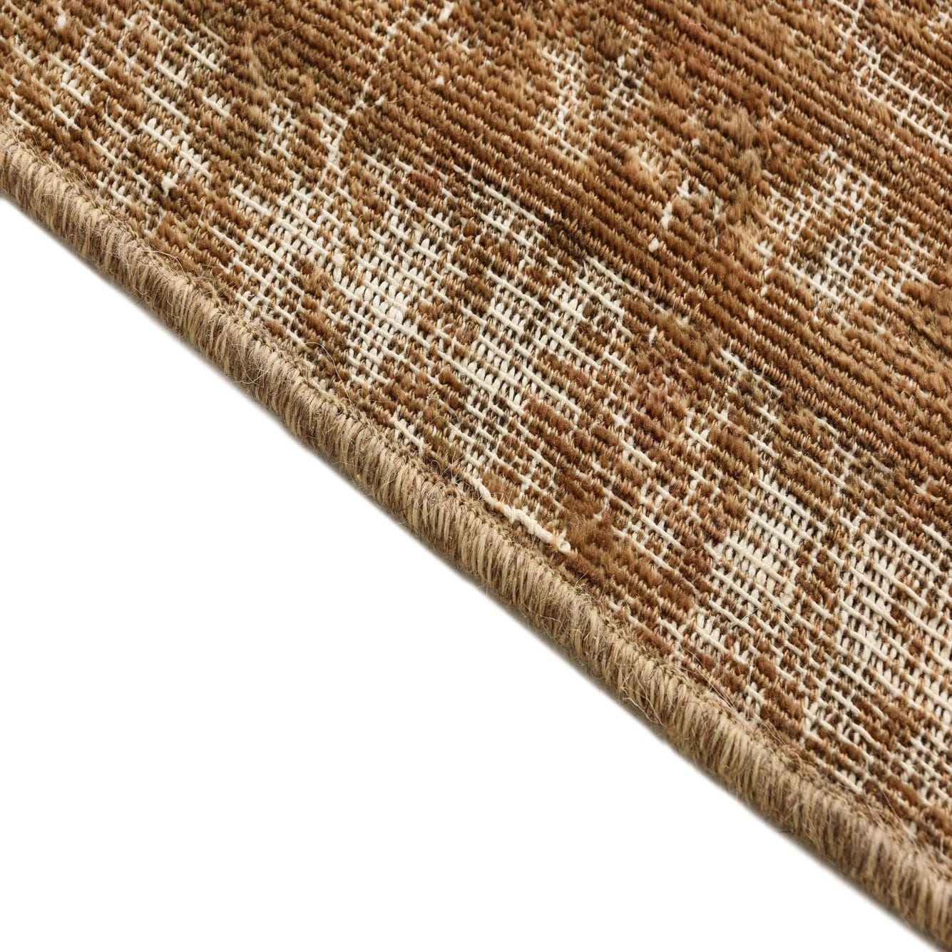 Primary color is Brown. Colors in this rug include: Brown, Ivory, Navy Blue.