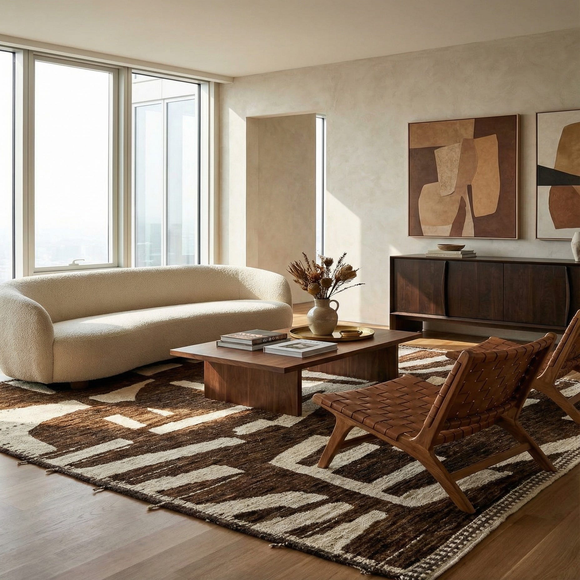 Primary color is Brown. Colors in this rug include: Brown, Rectangle.