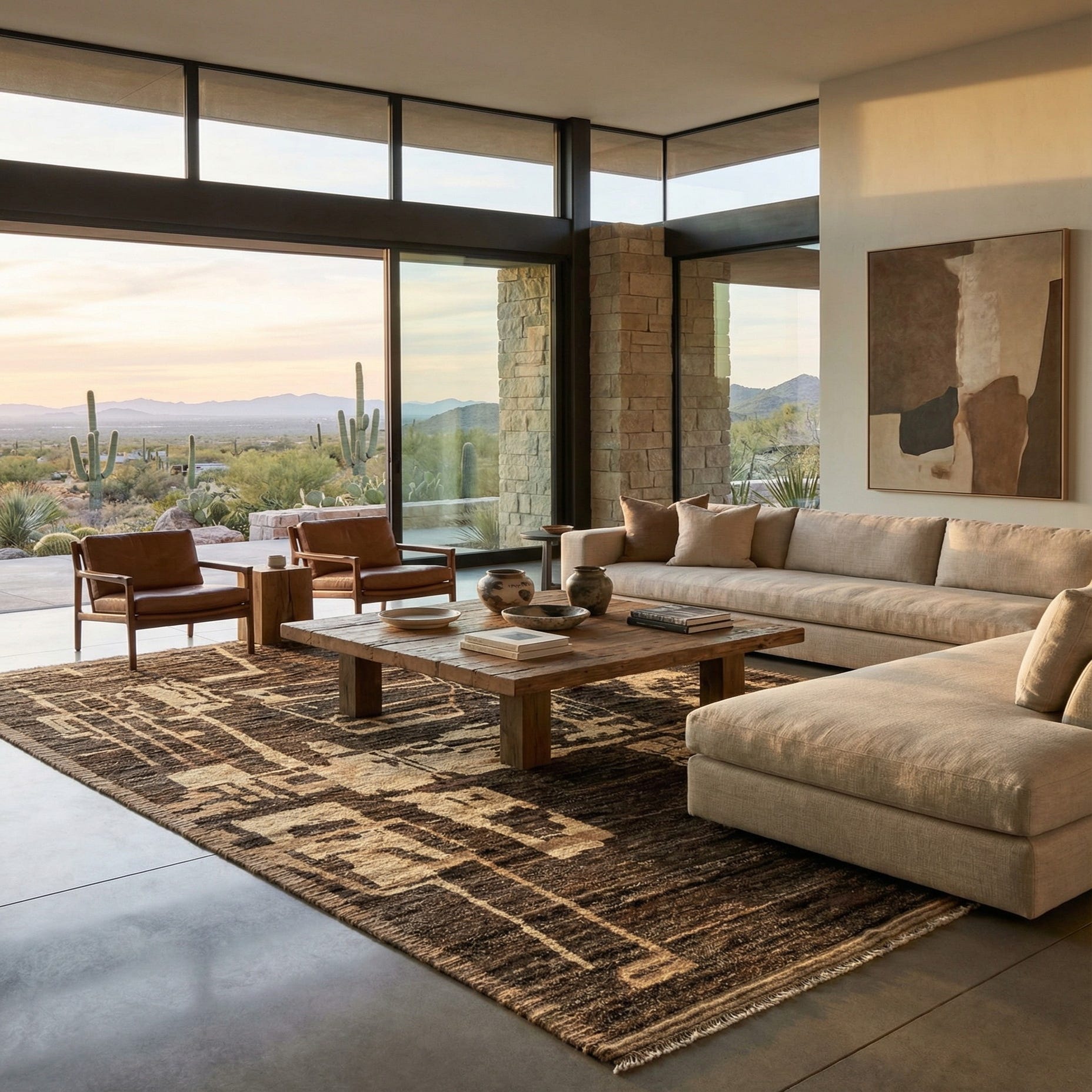 Primary color is Brown. Colors in this rug include: Brown, Rectangle.