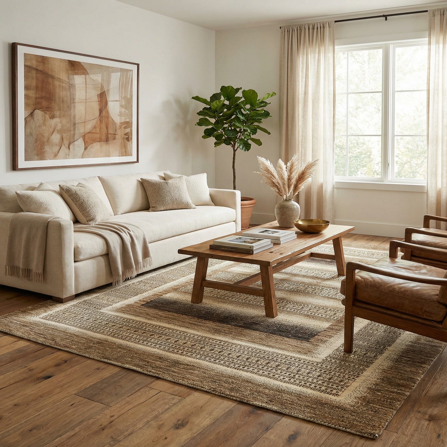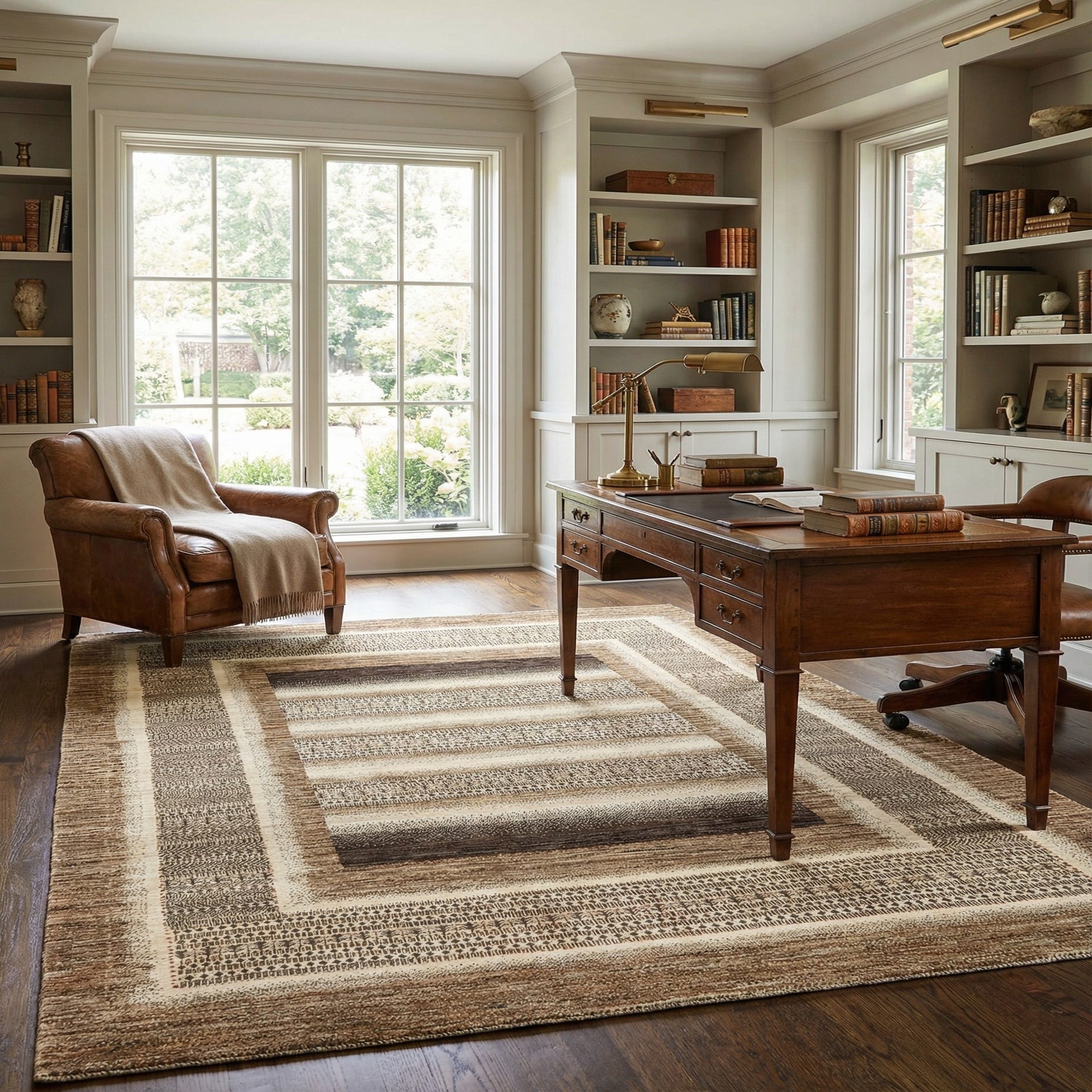 Primary color is Brown. Colors in this rug include: Brown, Rectangle.