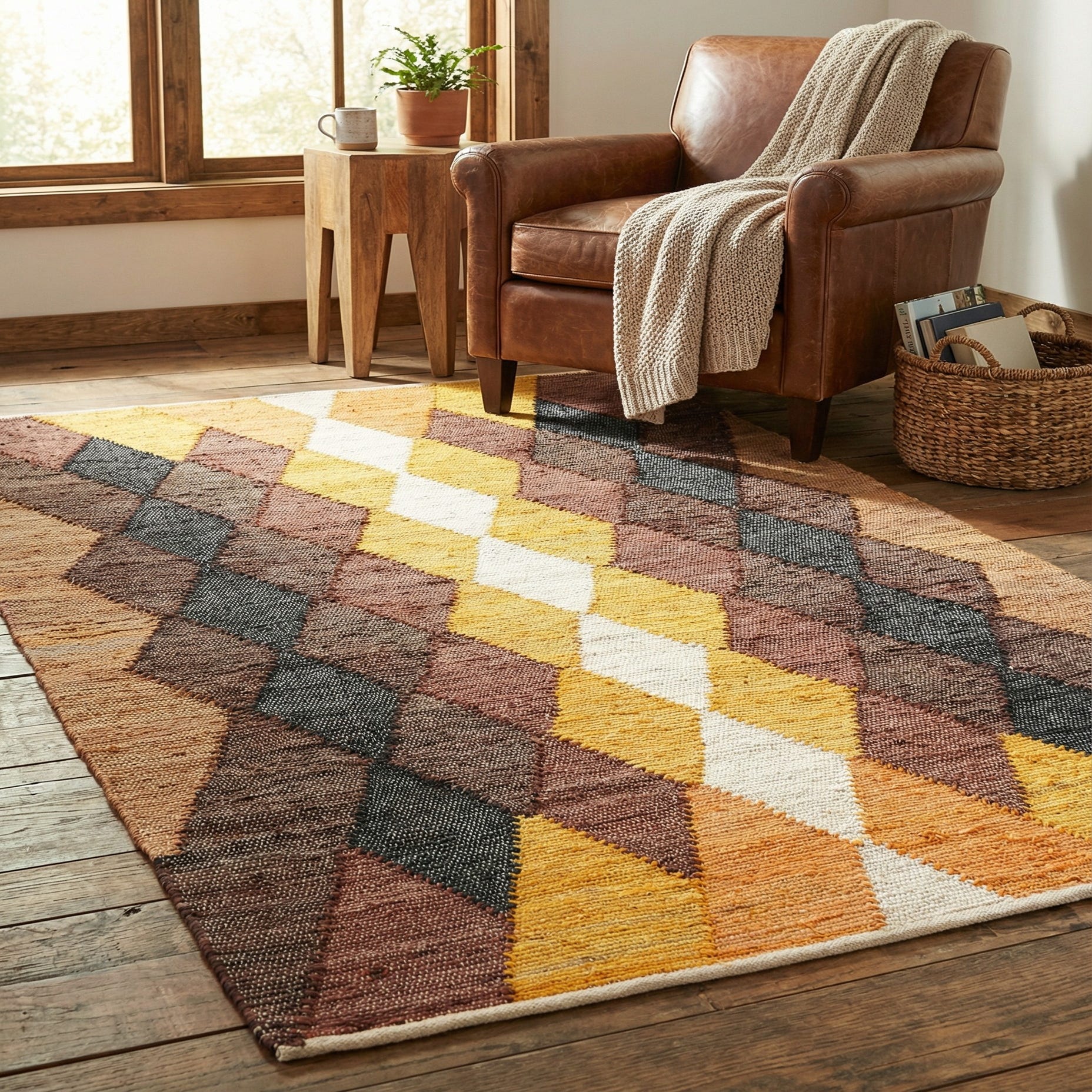 Primary color is Brown Yellow Black. Colors in this rug include: Brown Yellow Black, Ivory, Orange.