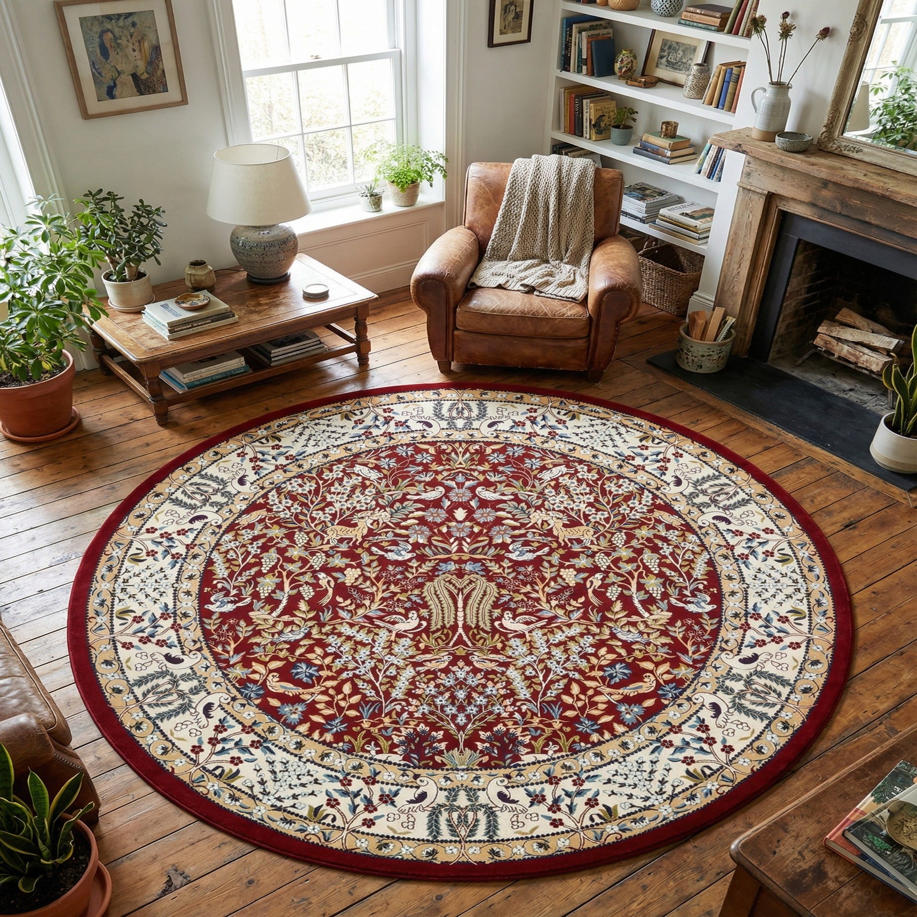 Primary color is Burgundy. Colors in this rug include: Burgundy, Beige, Blue, Cream, Green, Ivory, Navy Blue, Puce.