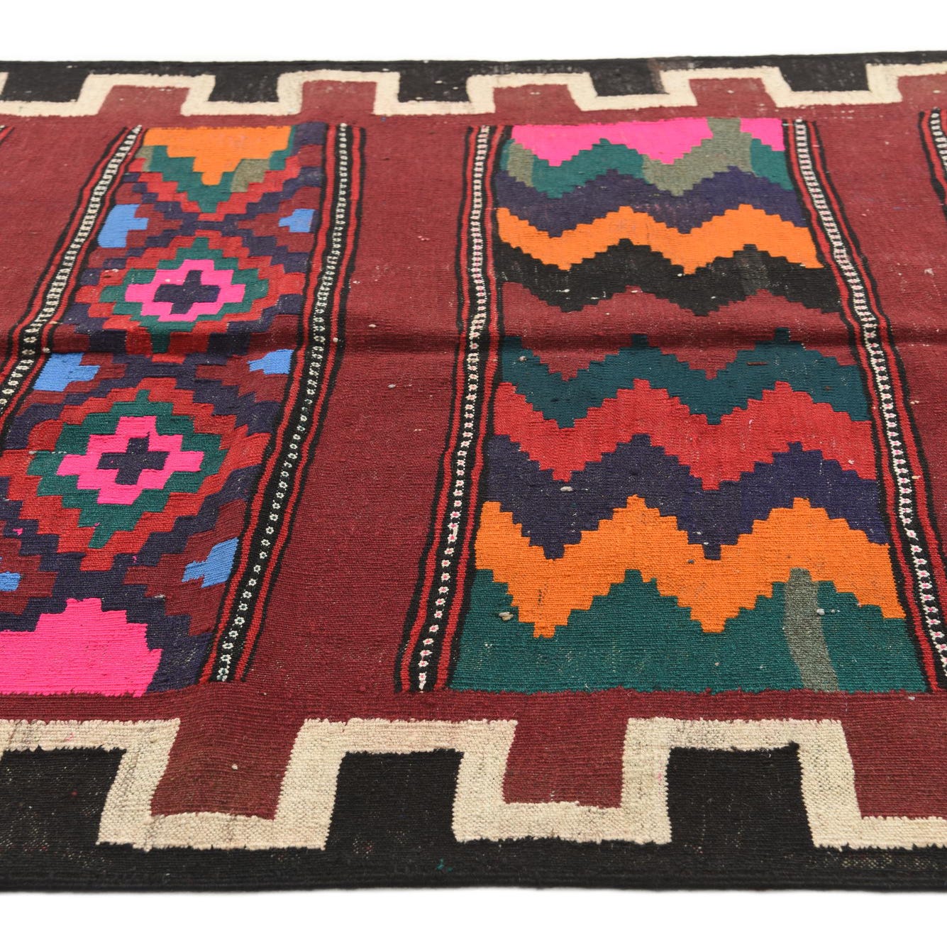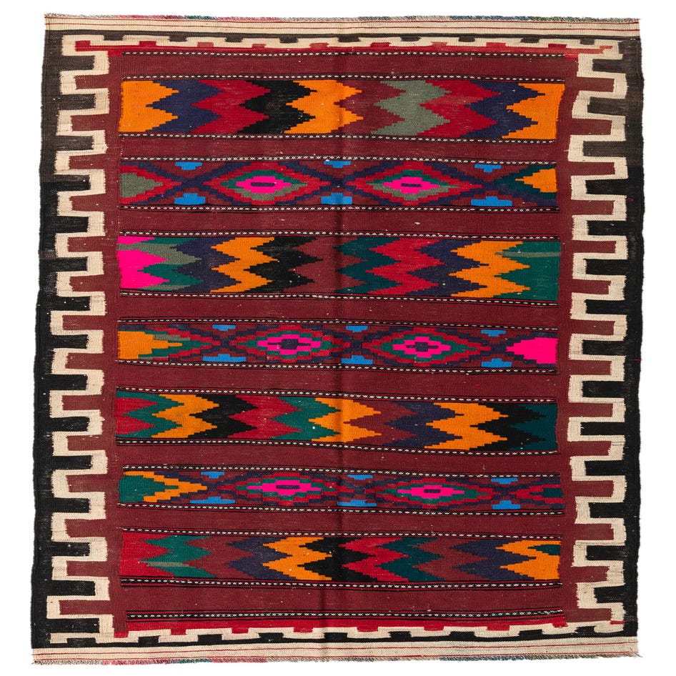 Primary color is Burgundy. Colors in this rug include: Burgundy, Black, Green, Ivory, Navy Blue, Orange, Red, Pink, Rust Red.