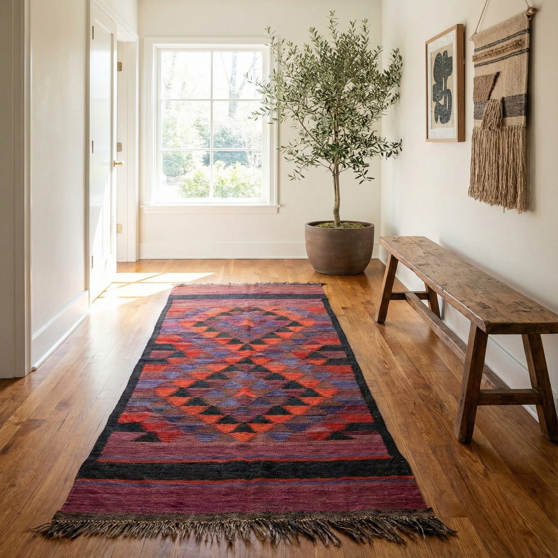 Primary color is Burgundy. Colors in this rug include: Burgundy, Black, Orange, Purple, Brown.