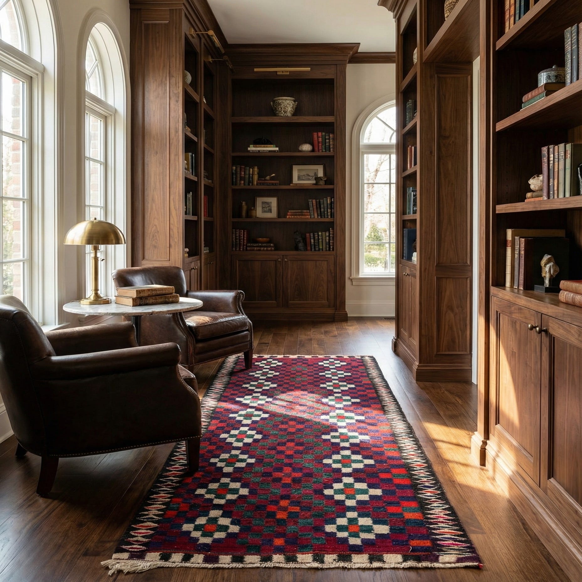 Primary color is Burgundy. Colors in this rug include: Burgundy, Ivory, Navy Blue, Pink, Black.