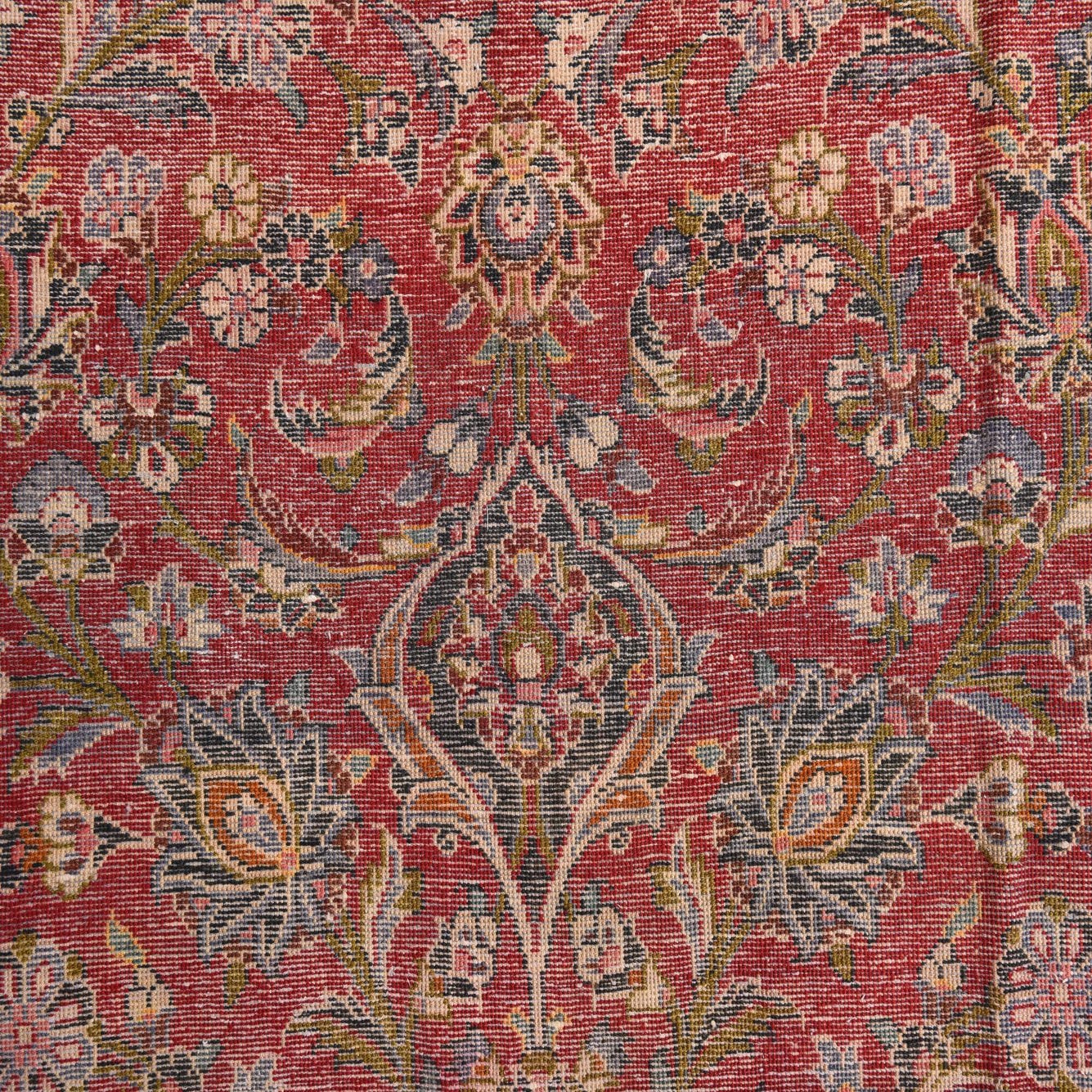 Primary color is Burgundy. Colors in this rug include: Burgundy, Beige, Blue, Brown, Ivory, Light Blue, Light Brown, Light Green, Light Salmon, Olive, Tan, Terracotta.