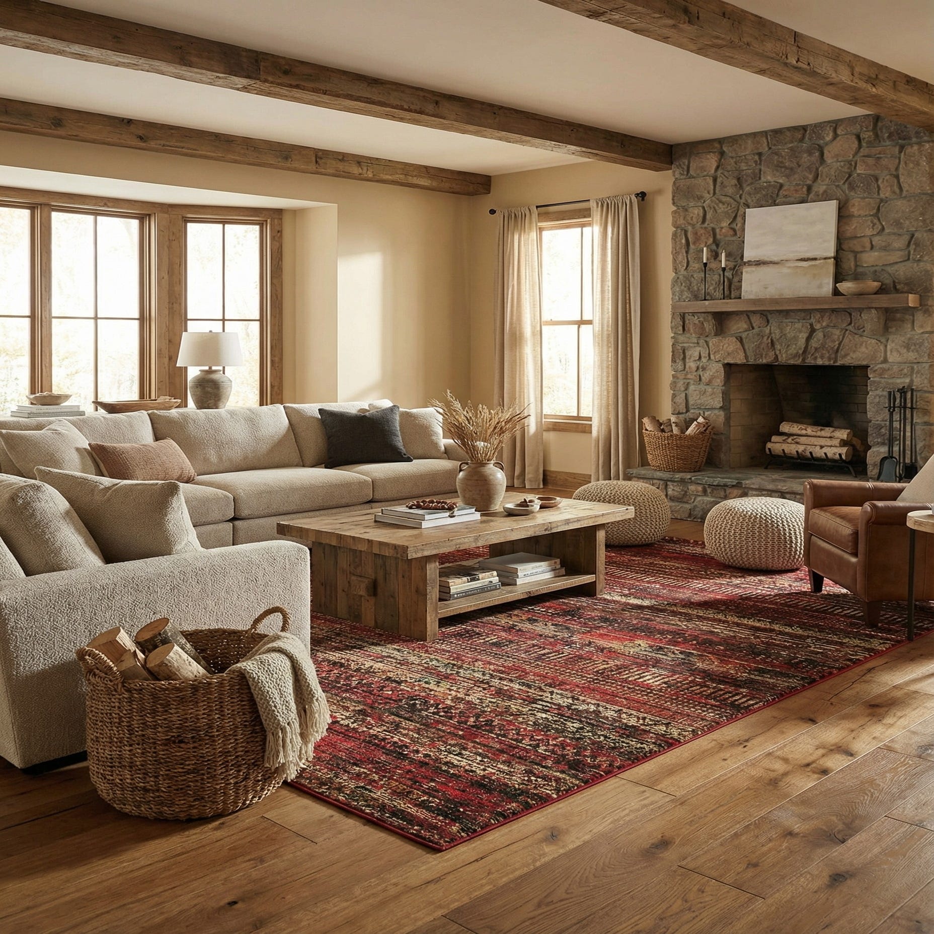 Primary color is Burgundy. Colors in this rug include: Burgundy, Beige, Black, Brown, Light Brown, Maroon.
