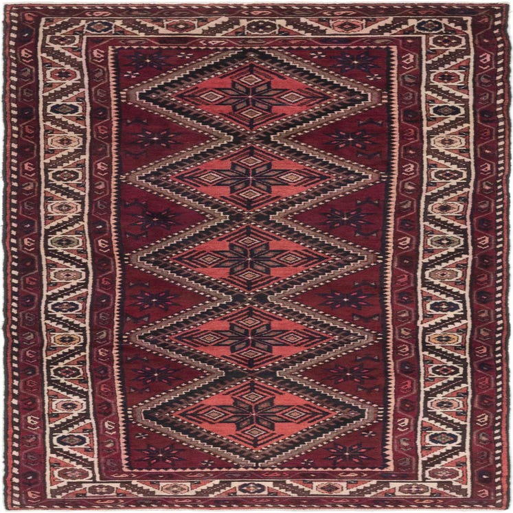 Primary color is Burgundy. Colors in this rug include: Burgundy, Beige, Black, Brown, Ivory, Peach.