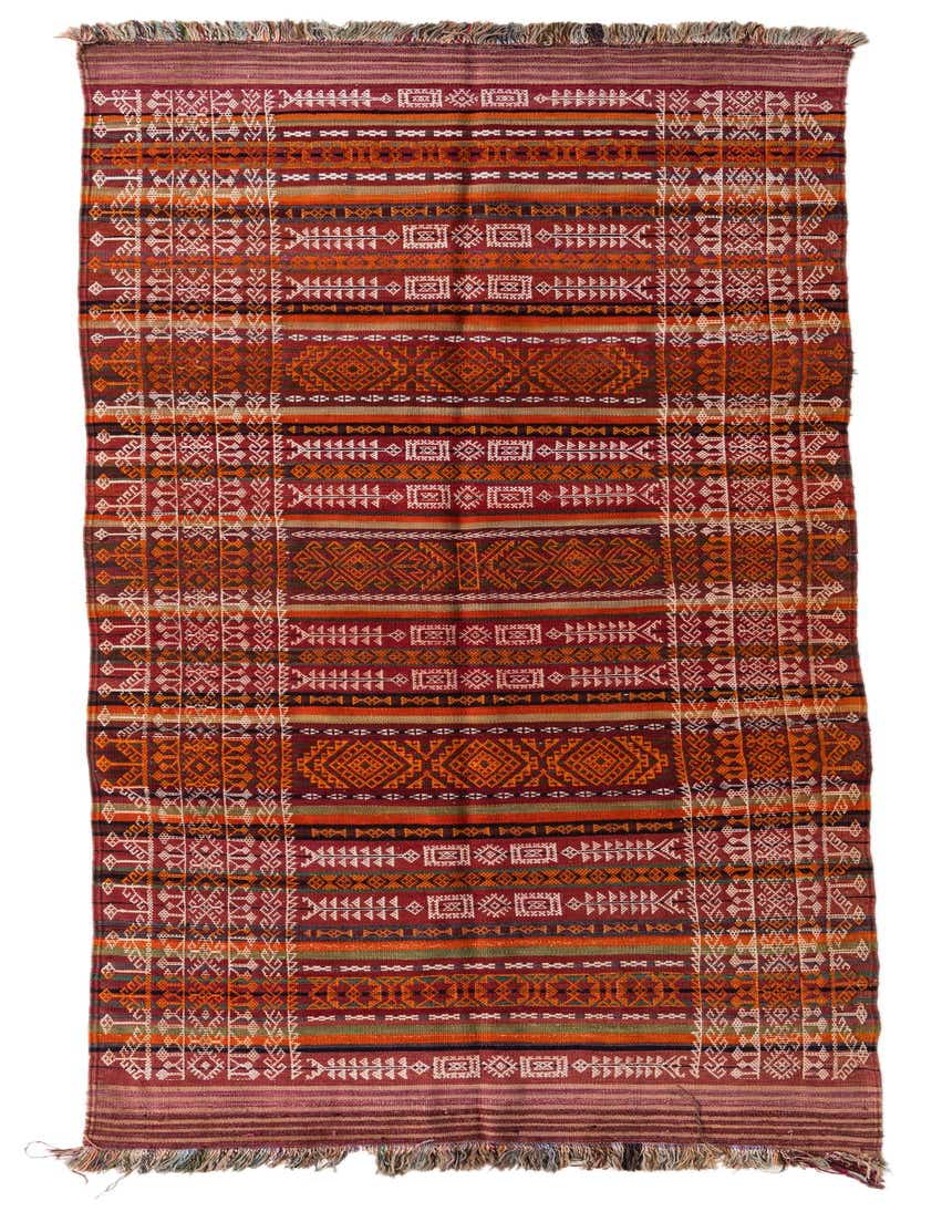 Primary color is Burgundy. Colors in this rug include: Burgundy, Beige, Black, Ivory, Orange, Green, Violet.