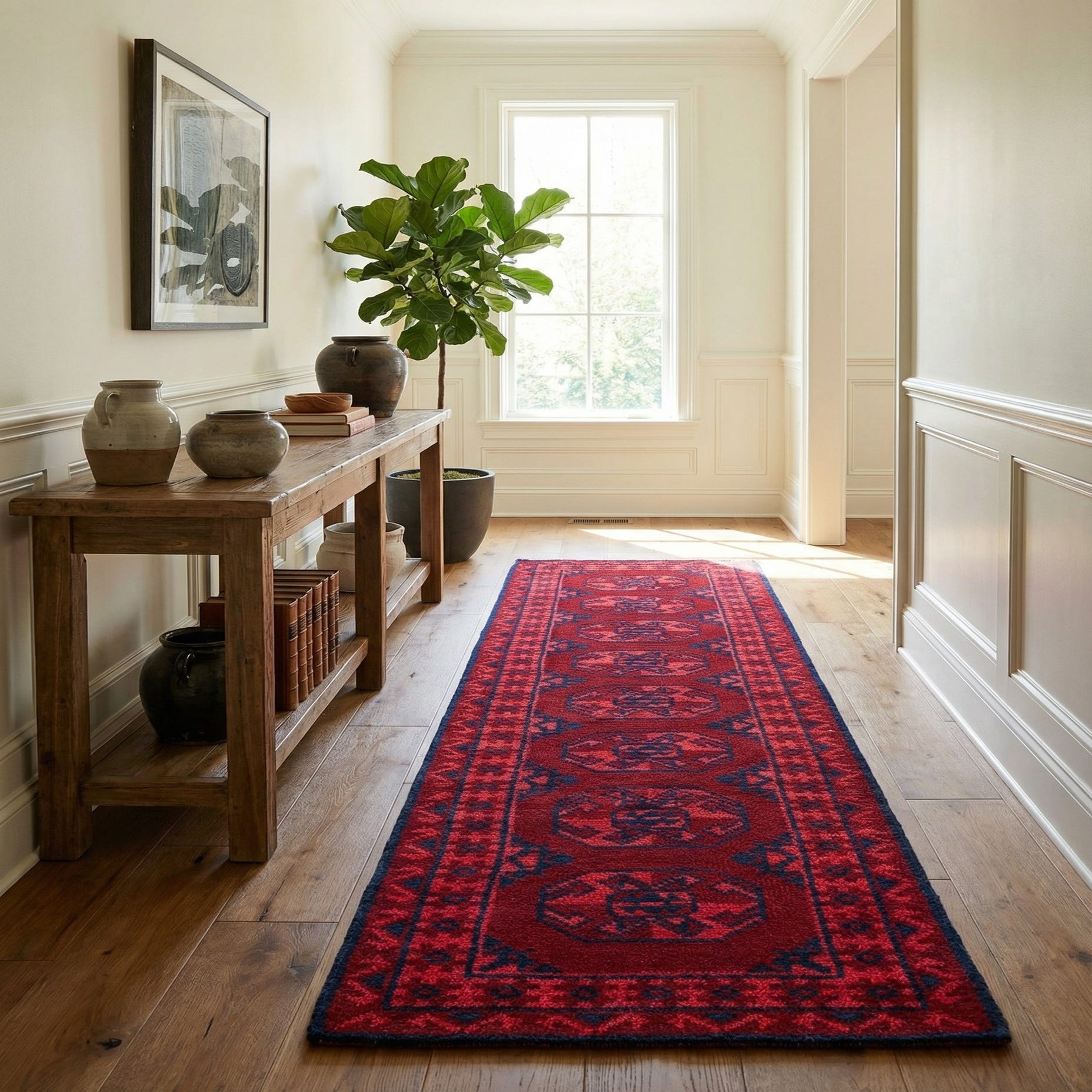 Primary color is Burgundy. Colors in this rug include: Burgundy, Navy Blue, Red.