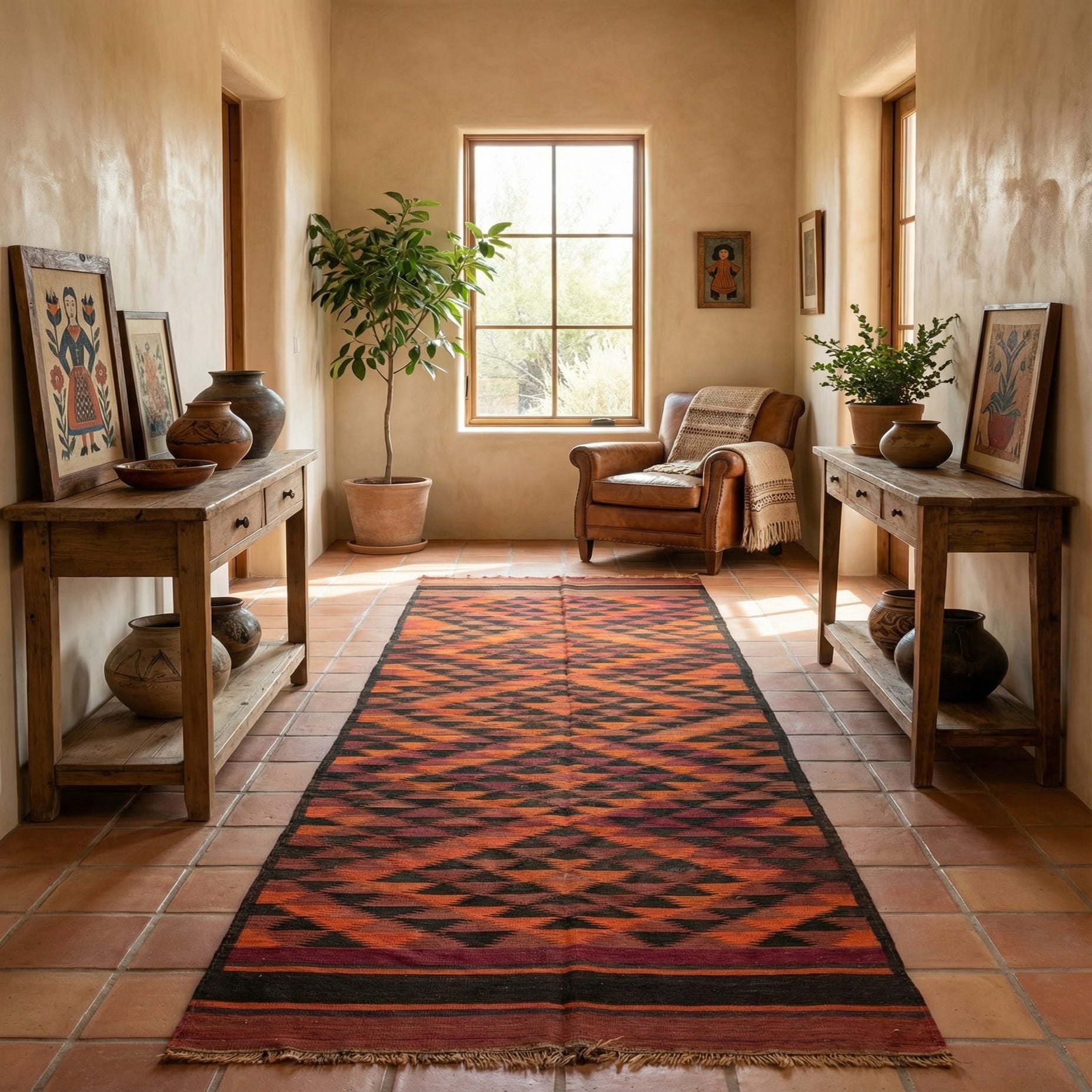 Primary color is Burgundy. Colors in this rug include: Burgundy, Brown, Orange.
