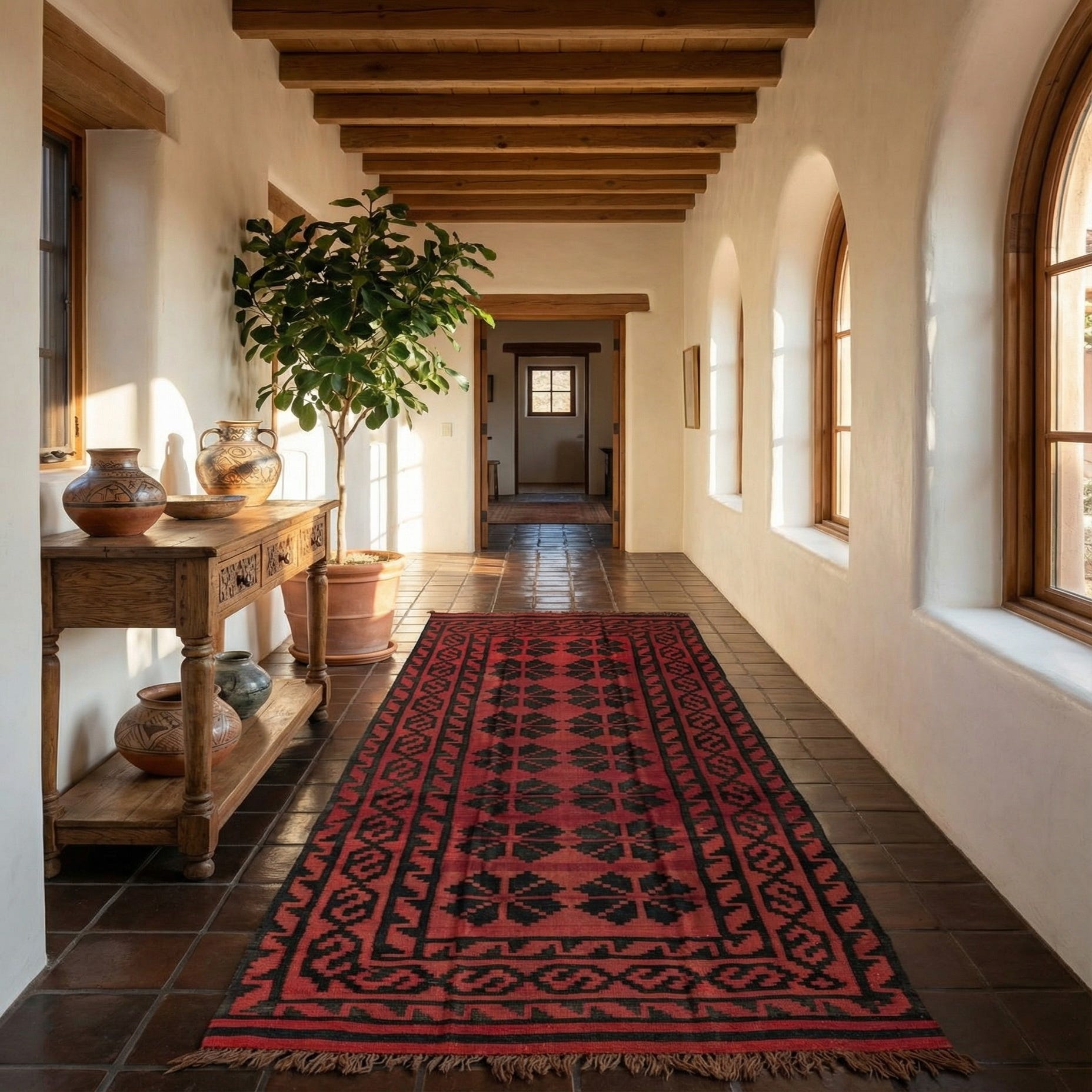 Primary color is Burgundy. Colors in this rug include: Burgundy, Black.