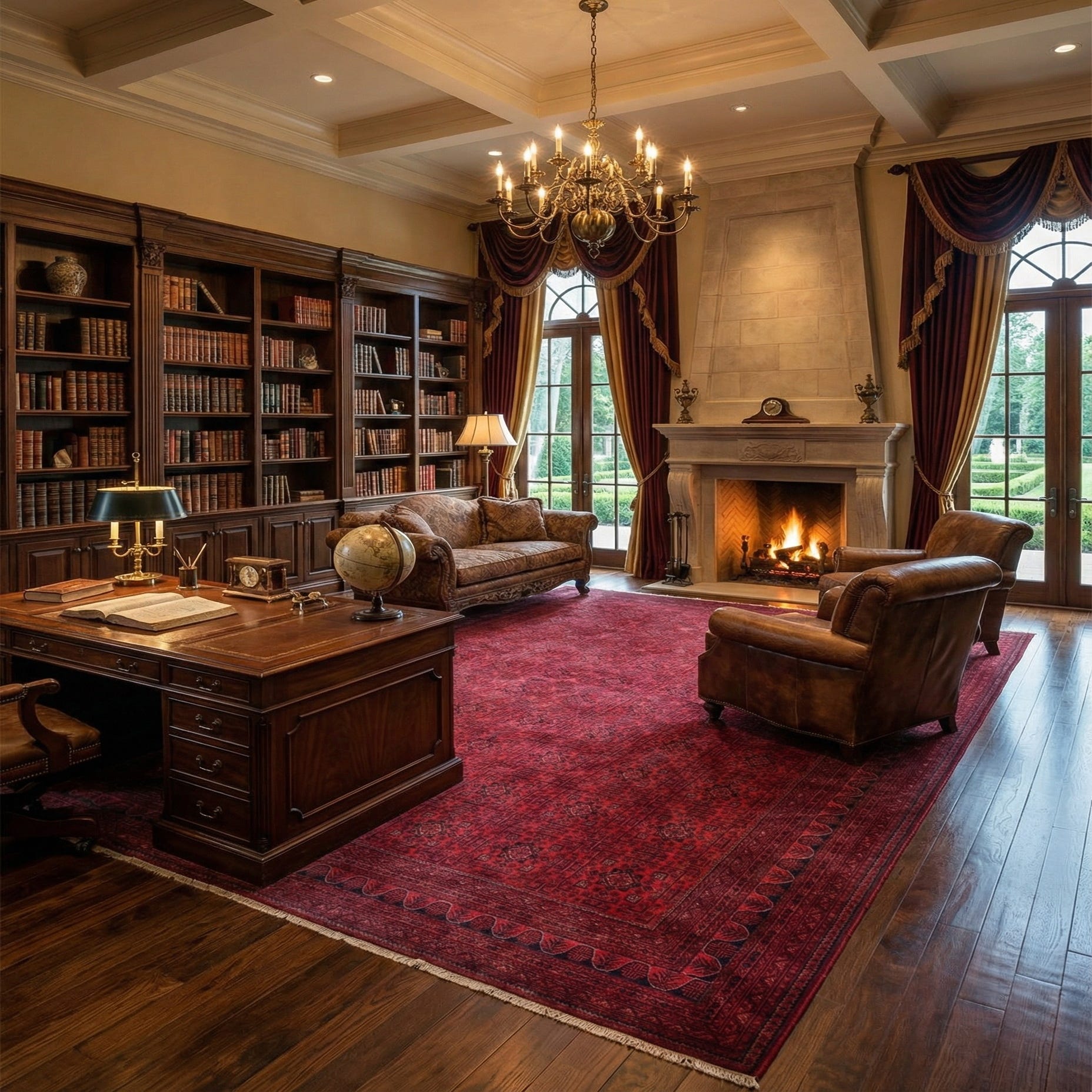 Primary color is Burgundy. Colors in this rug include: Burgundy, Black, Ivory.