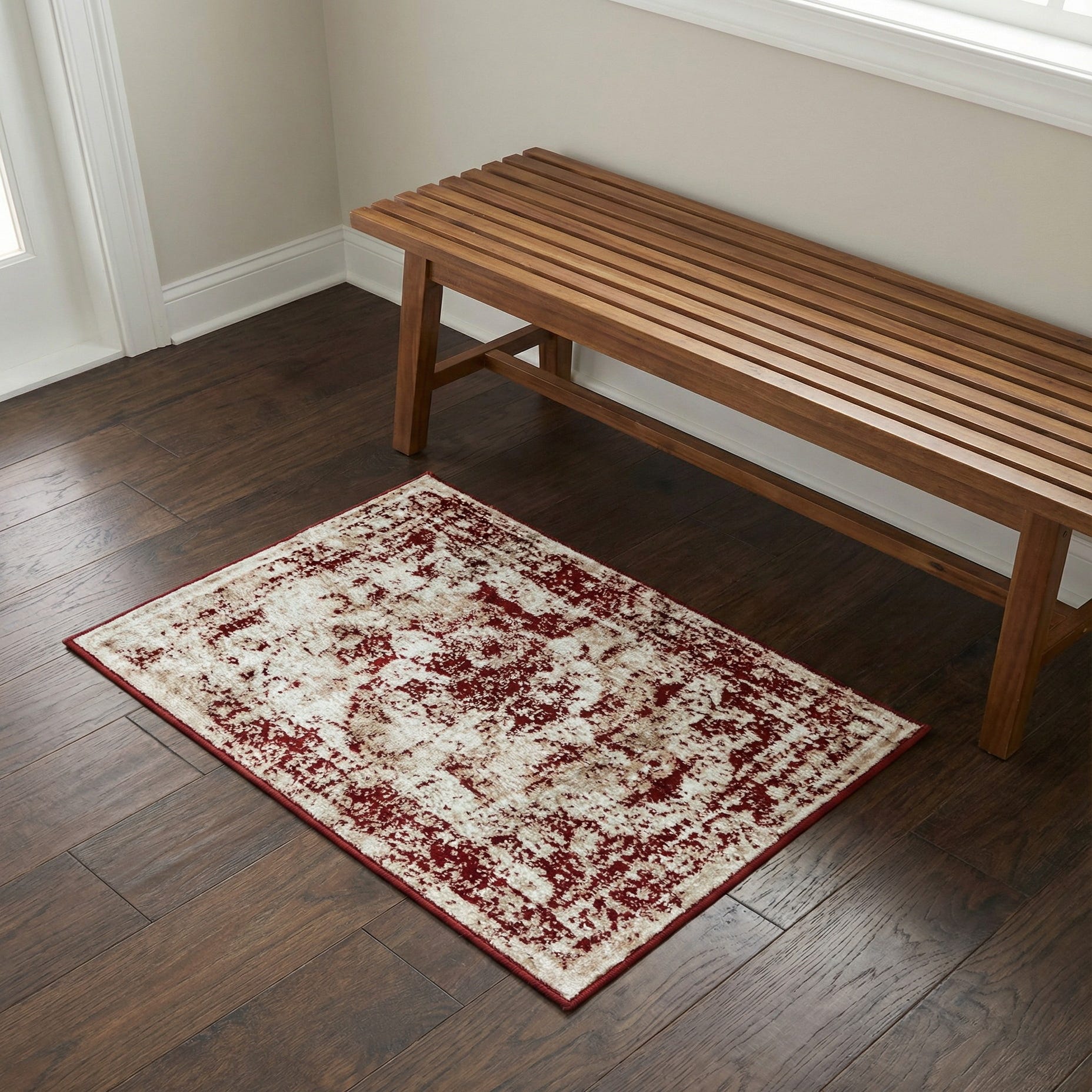 Primary color is Burgundy. Colors in this rug include: Burgundy, Beige, Ivory, Light Brown.