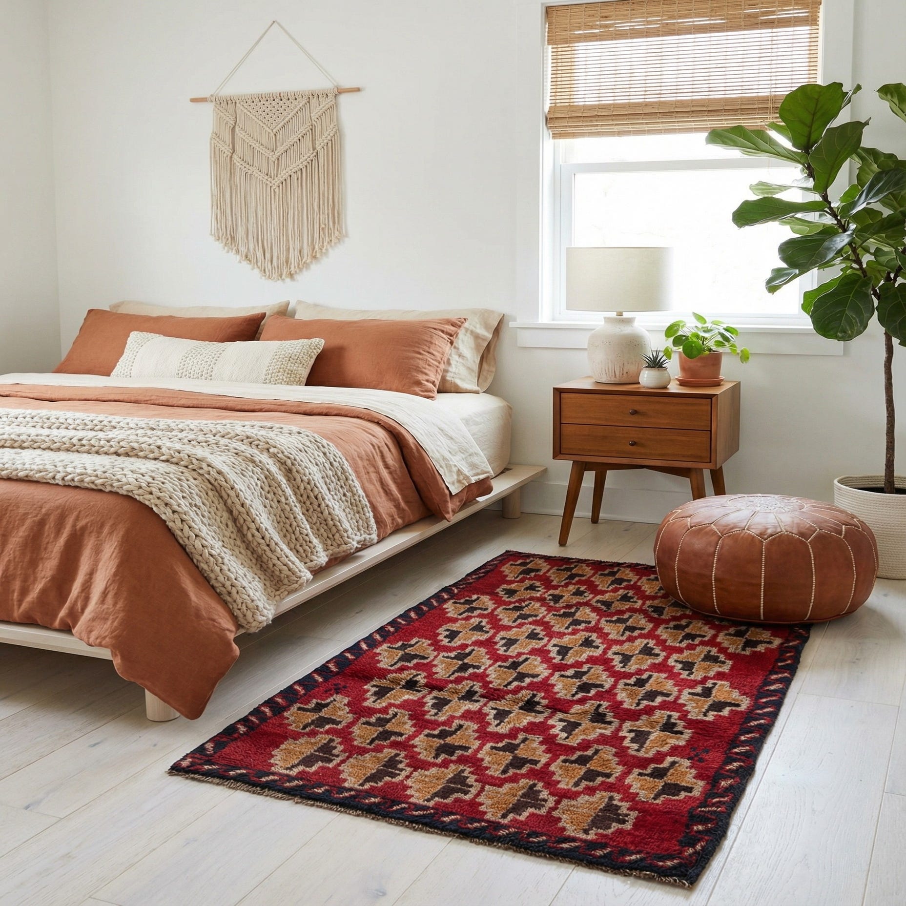 Primary color is Burgundy. Colors in this rug include: Burgundy, Maroon, Navy Blue, Terracotta.