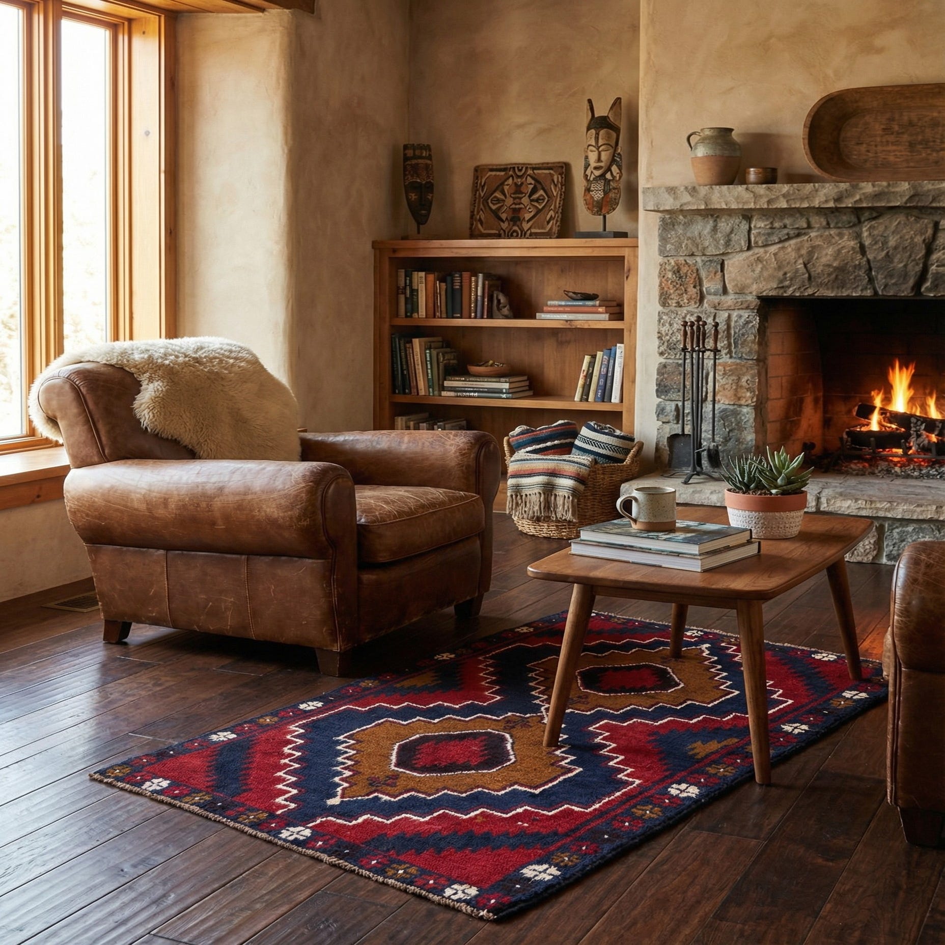 Primary color is Burgundy. Colors in this rug include: Burgundy, Navy Blue, Terracotta, Ivory, Maroon.
