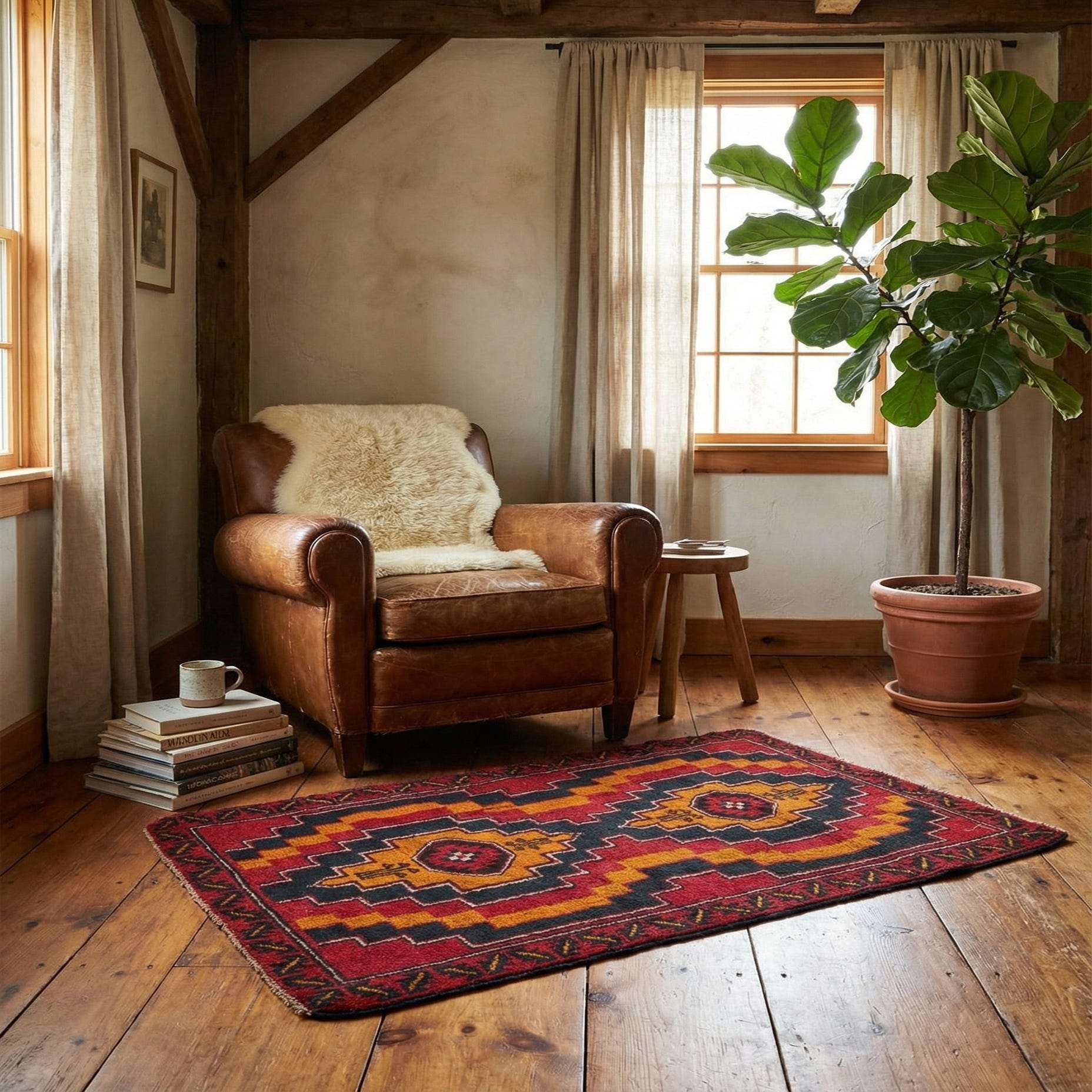Primary color is Burgundy. Colors in this rug include: Burgundy, Black, Terracotta, Maroon.