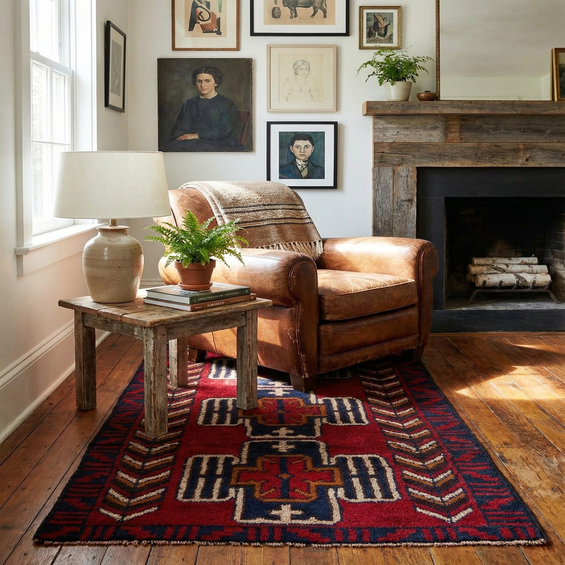 Primary color is Burgundy. Colors in this rug include: Burgundy, Brown, Maroon, Beige, Navy Blue.