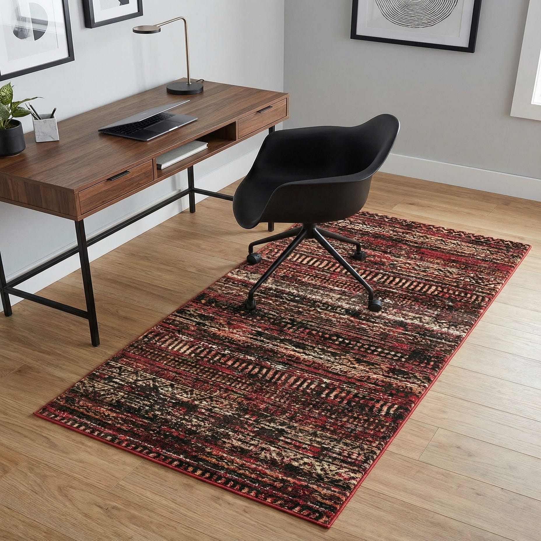 Primary color is Burgundy. Colors in this rug include: Burgundy, Beige, Black, Brown, Light Brown, Maroon.