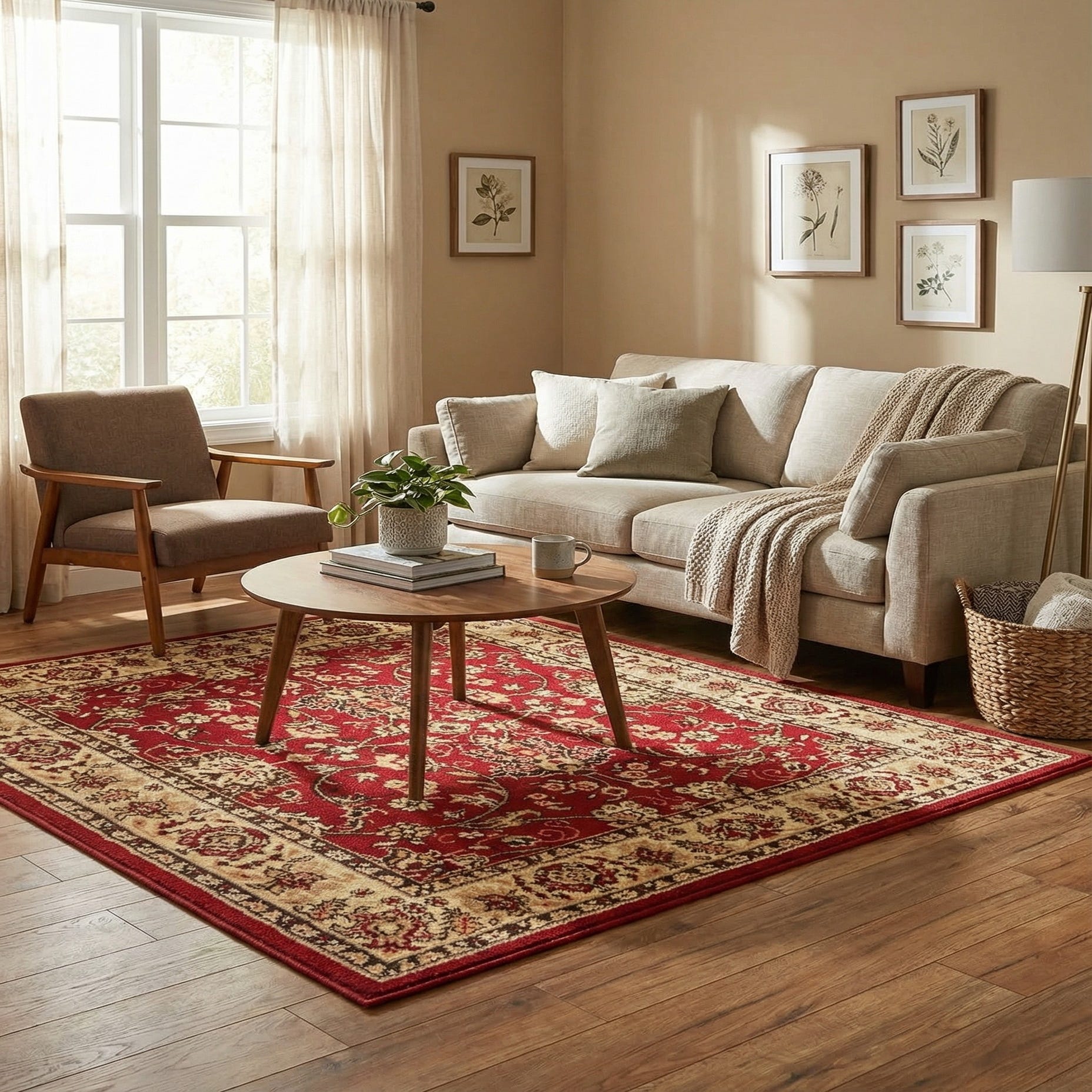 Primary color is Burgundy. Colors in this rug include: Burgundy, Beige, Black, Cream, Brown.