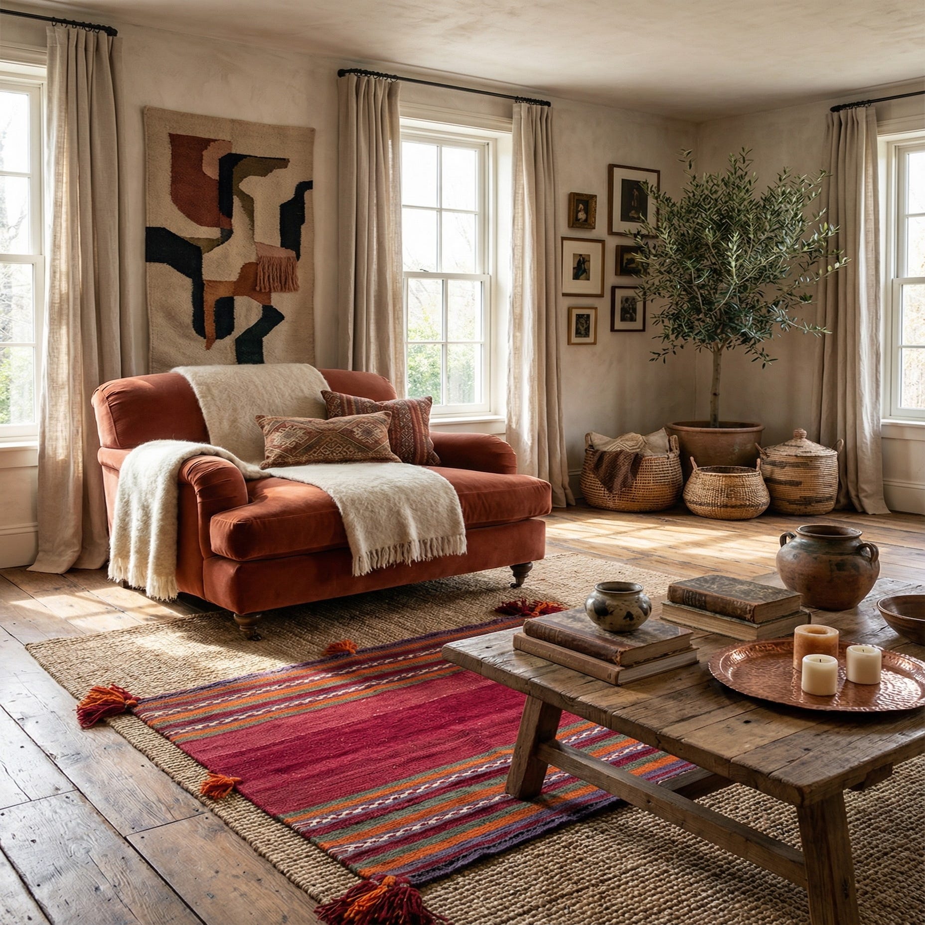 Primary color is Burgundy. Colors in this rug include: Burgundy, Green, Orange, Red, Purple.