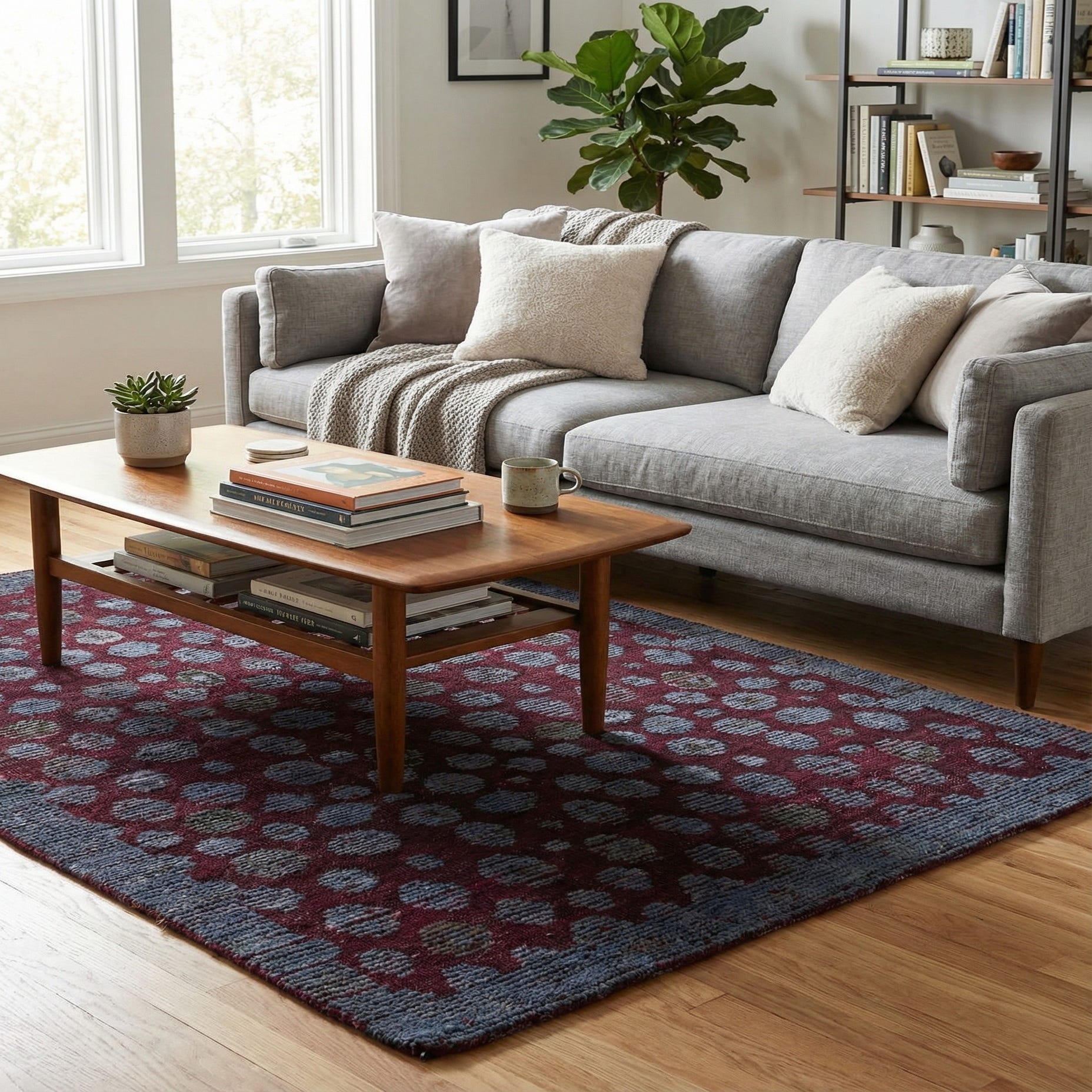 Primary color is Burgundy. Colors in this rug include: Burgundy, Gray.