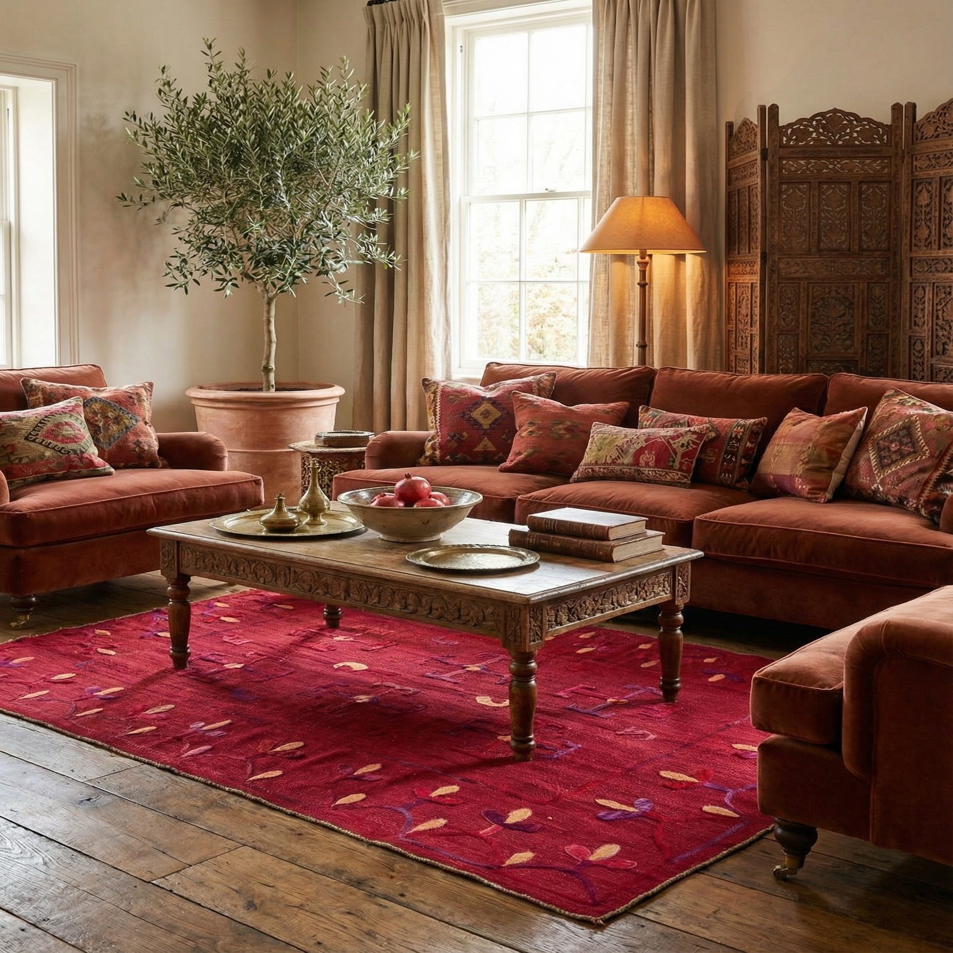 Primary color is Burgundy. Colors in this rug include: Burgundy, Peach, Purple, Red, Violet, Pink, Green.