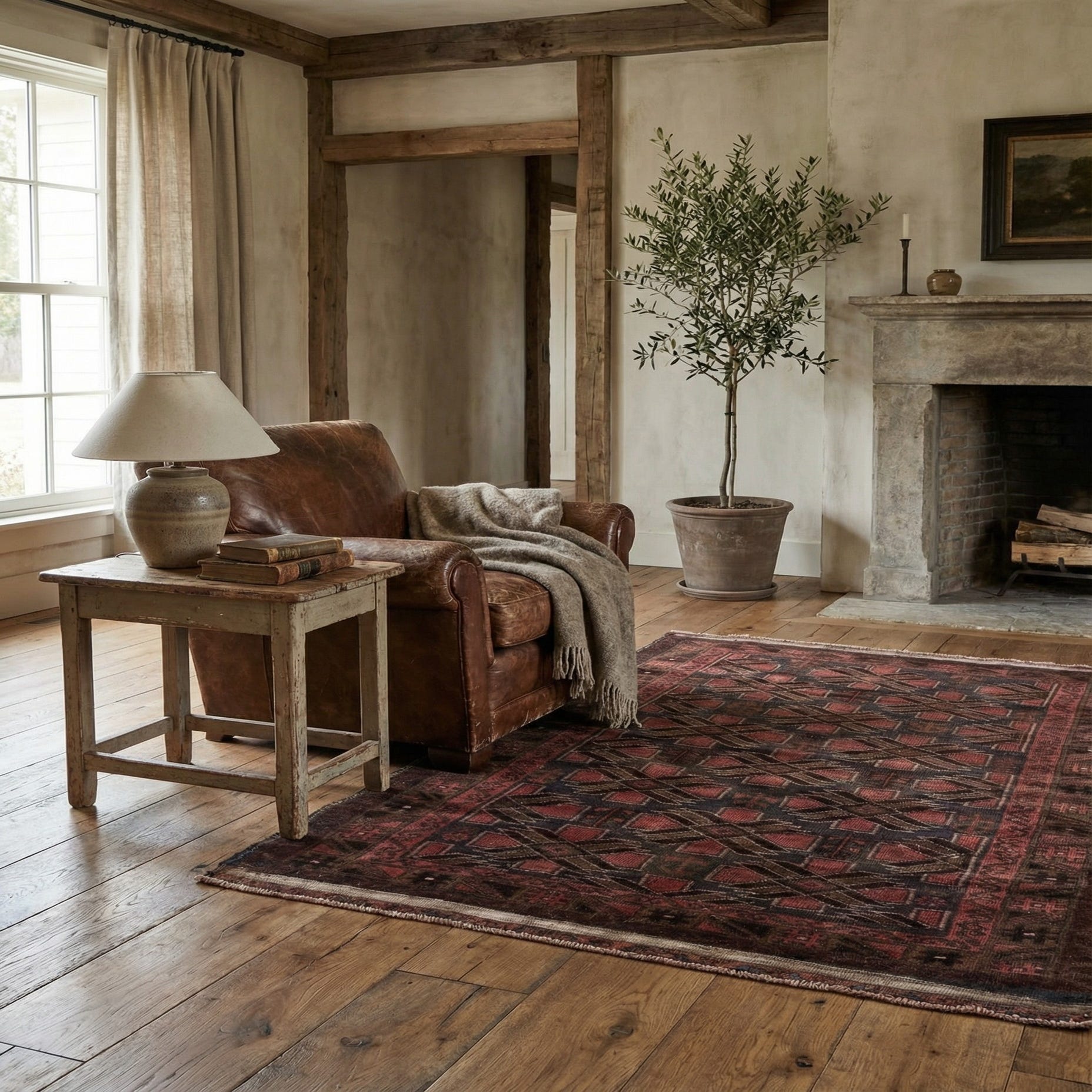 Primary color is Burgundy. Colors in this rug include: Burgundy, Brown, Navy Blue.