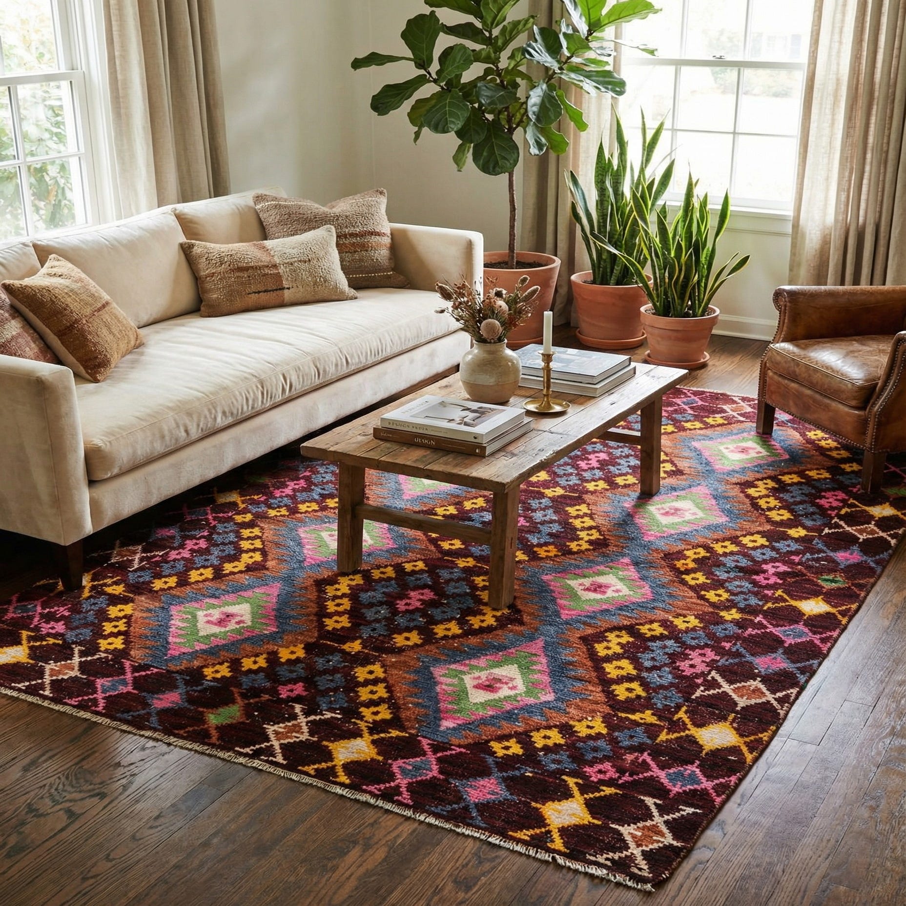 Primary color is Burgundy. Colors in this rug include: Burgundy, Brown, Ivory, Purple, Terracotta, Yellow, Pink, Gray, Green.
