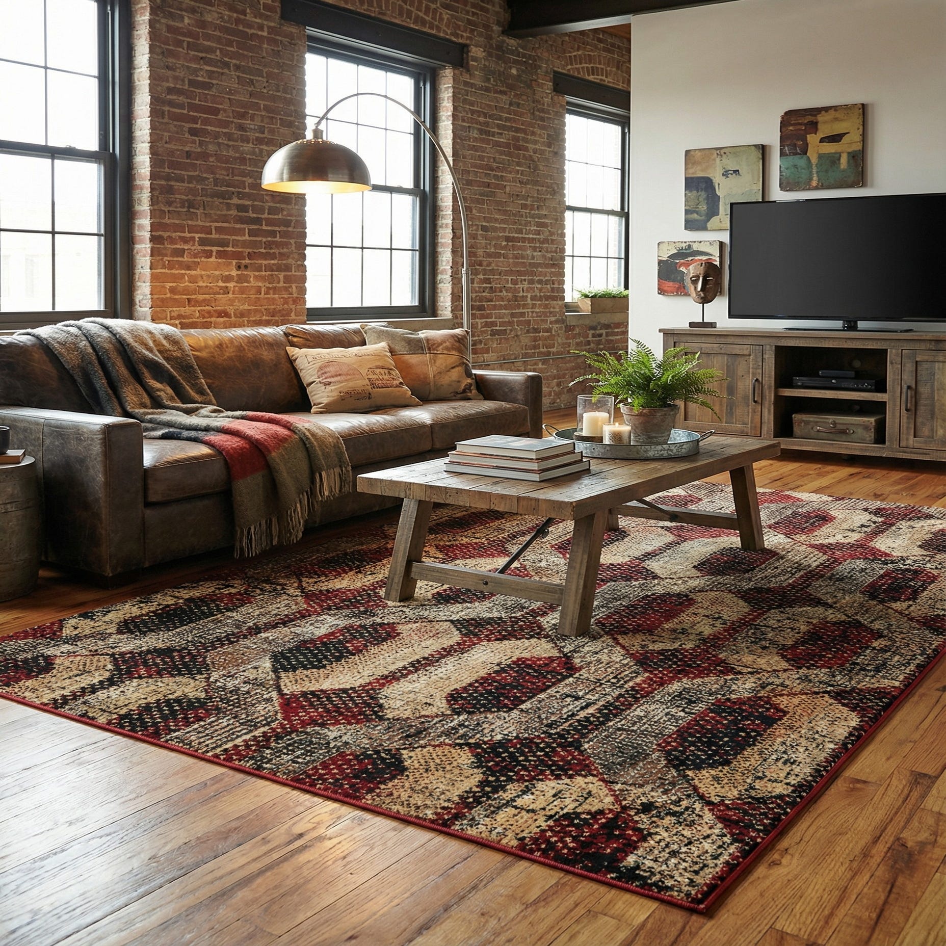 Primary color is Burgundy. Colors in this rug include: Burgundy, Beige, Black, Brown, Gray.