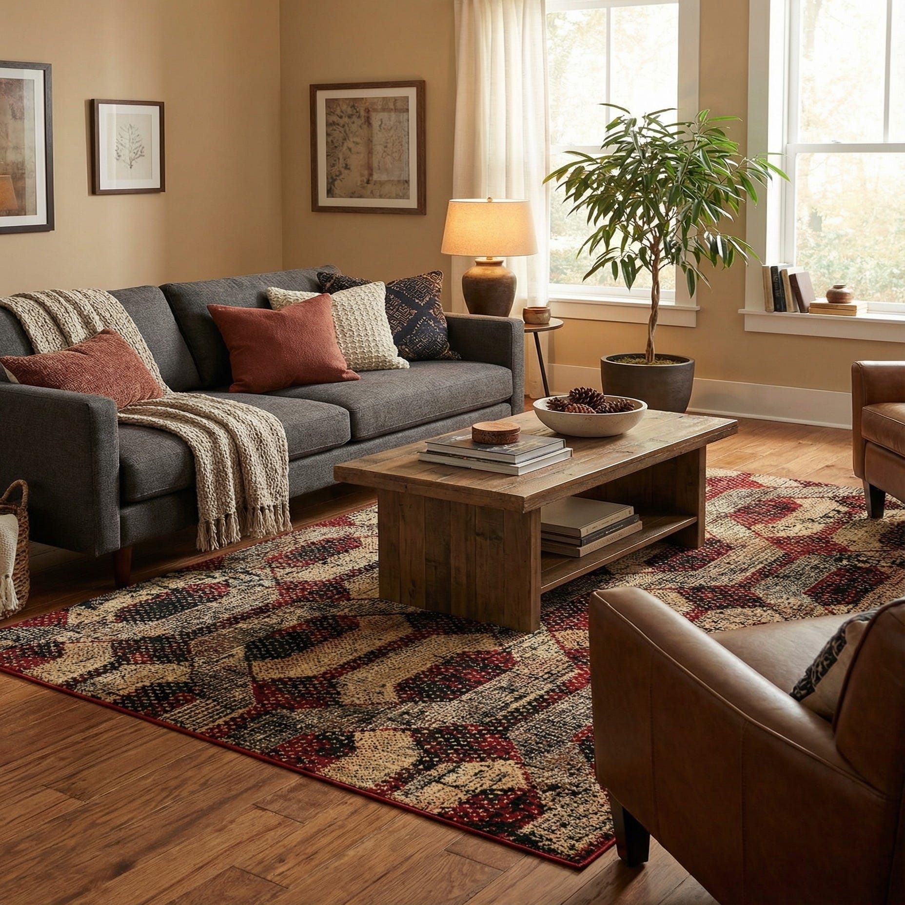 Primary color is Burgundy. Colors in this rug include: Burgundy, Beige, Black, Brown, Gray.
