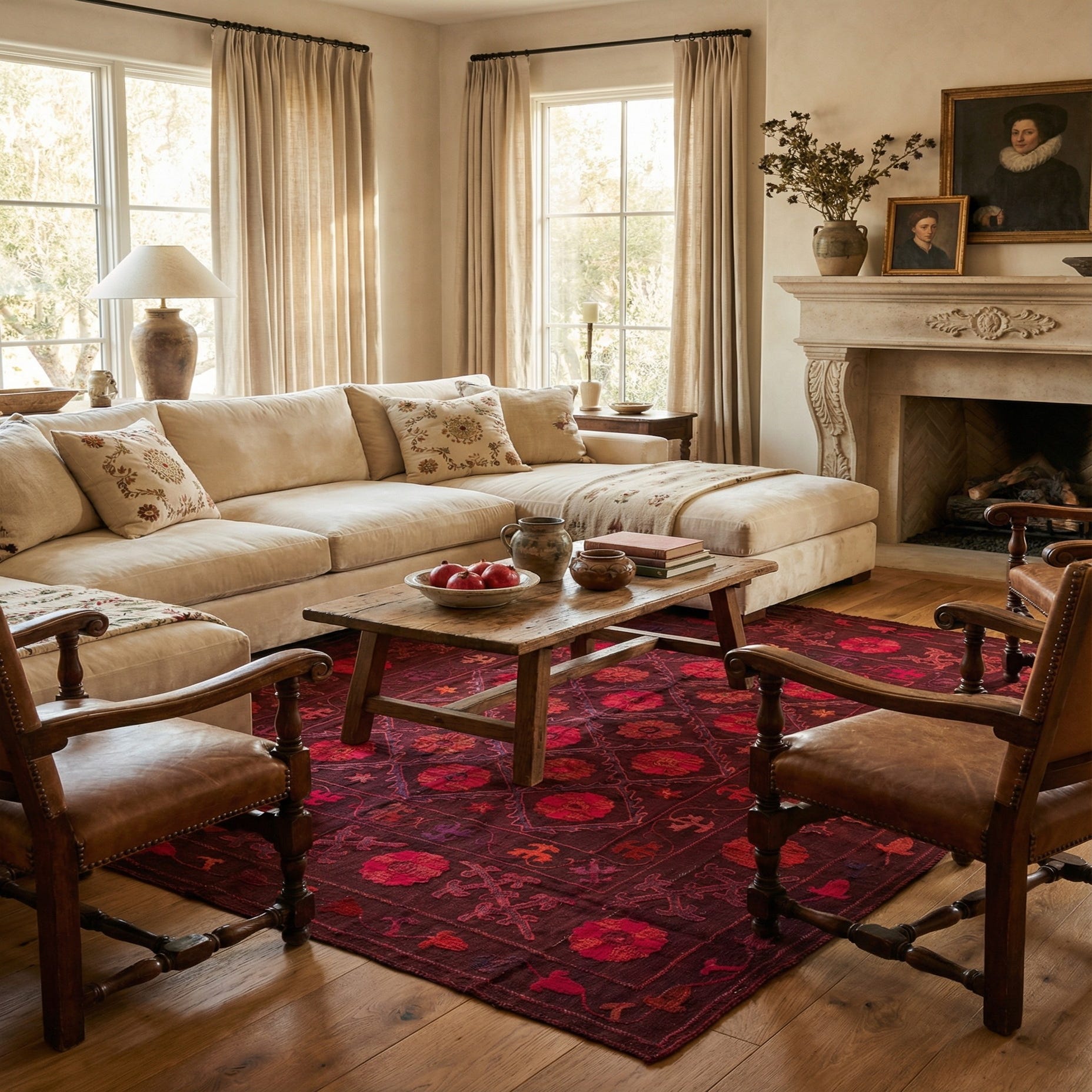 Primary color is Burgundy. Colors in this rug include: Burgundy, Red, Rust Red.