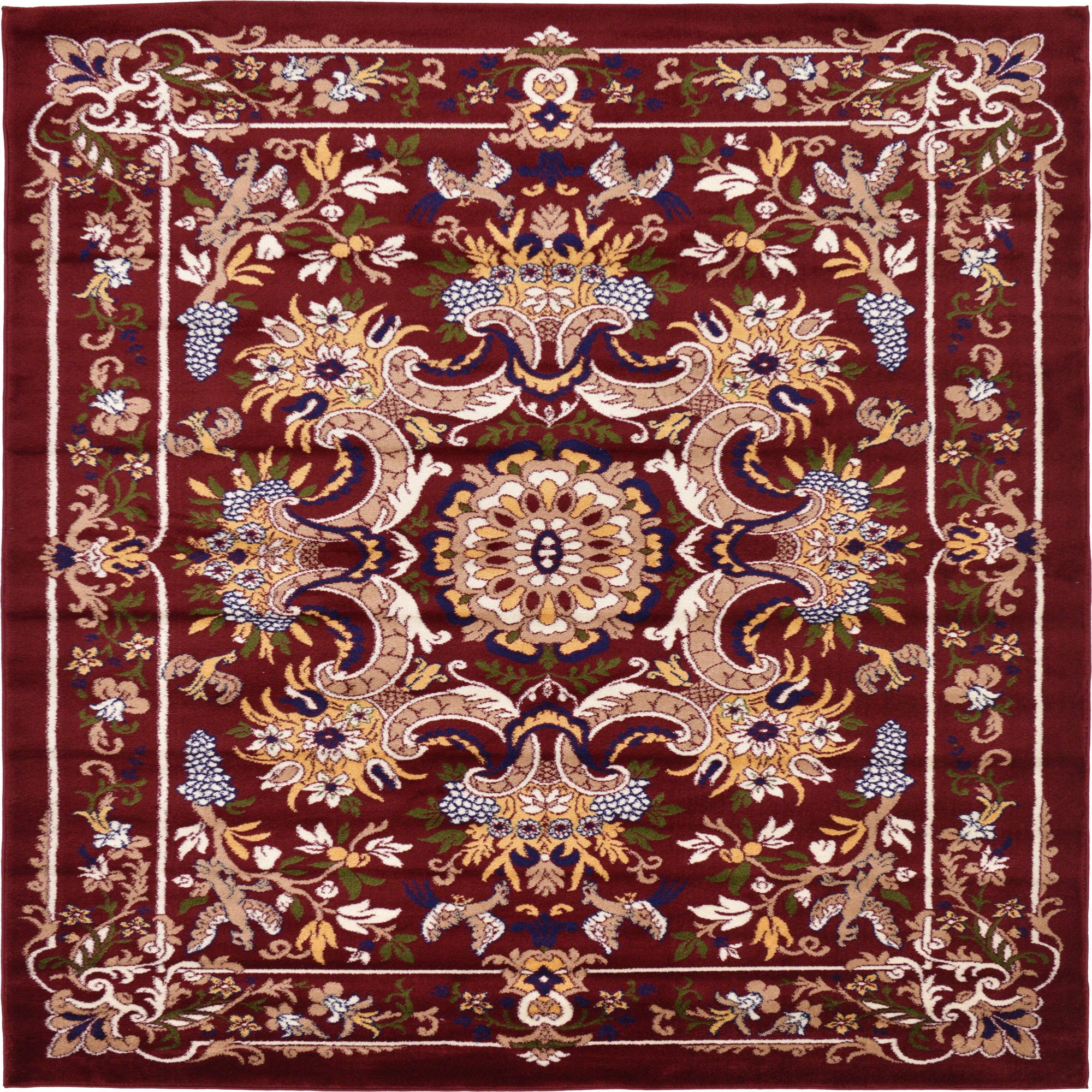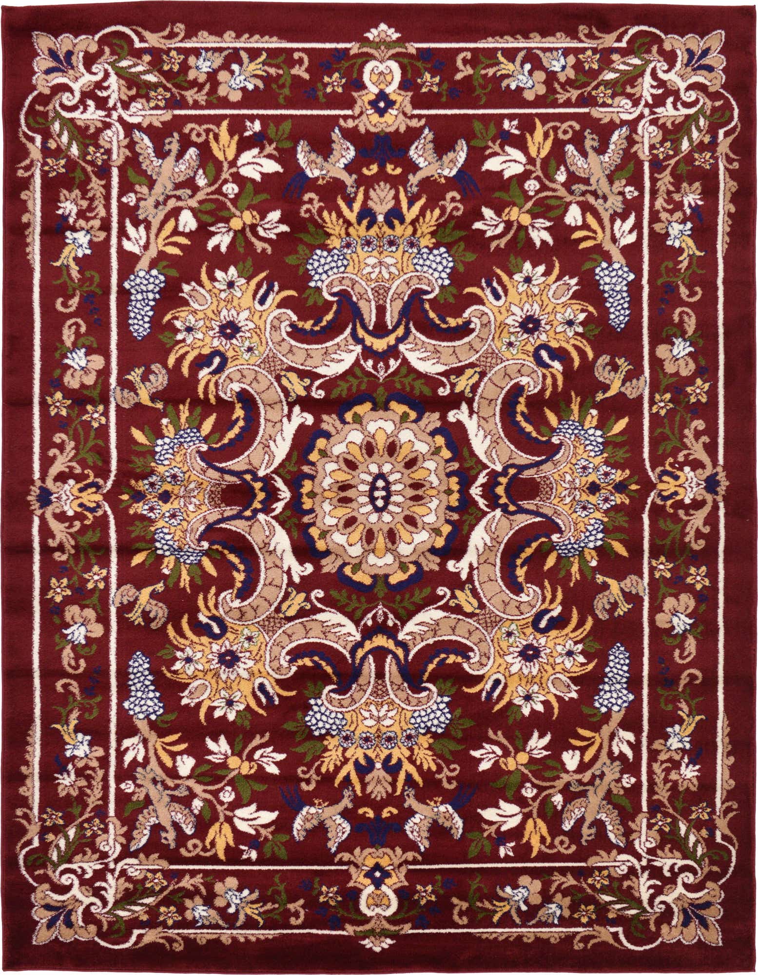 Primary color is Burgundy. Colors in this rug include: Burgundy, Beige, Cream, Green, Ivory, Navy Blue.