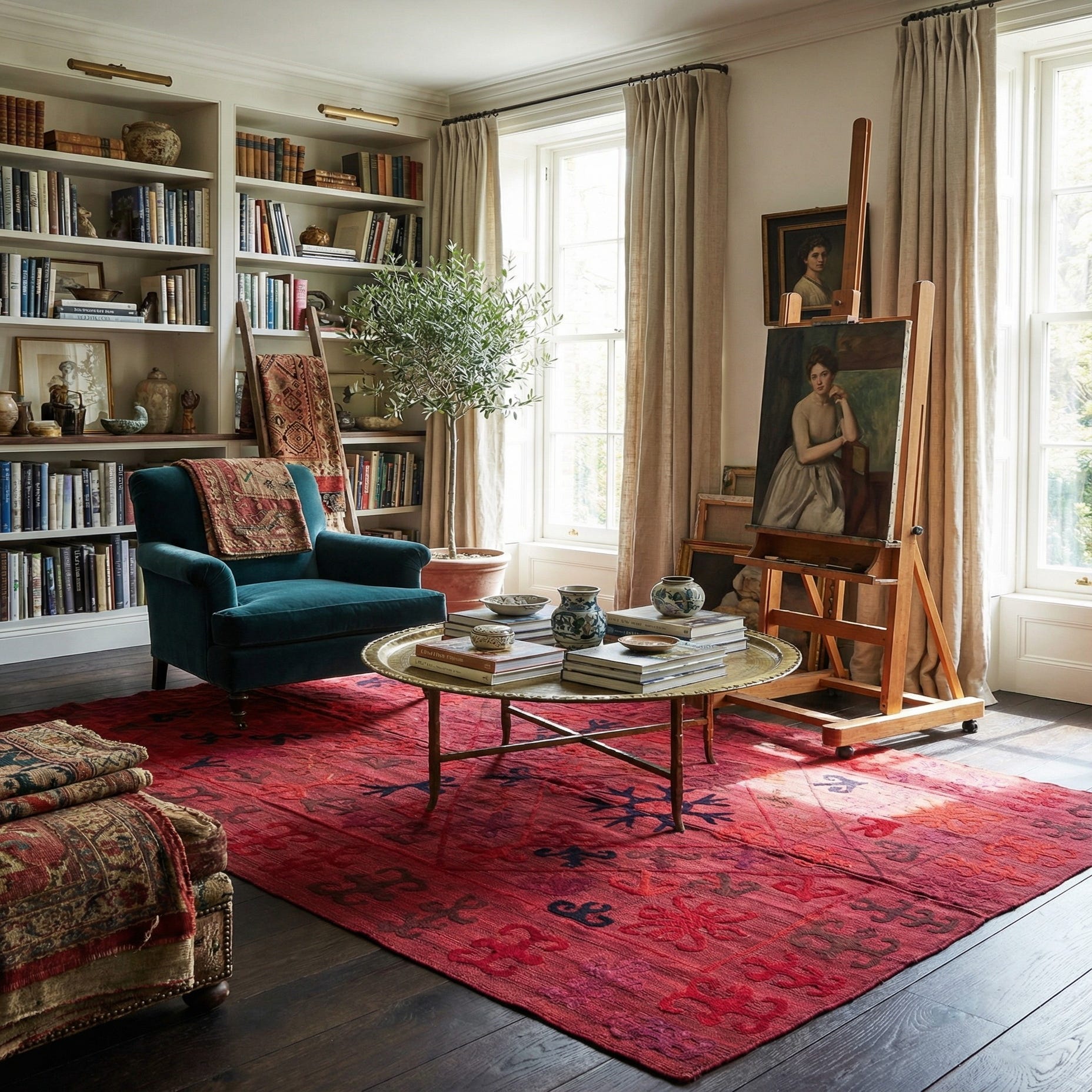 Primary color is Burgundy. Colors in this rug include: Burgundy, Navy Blue, Maroon, Red.