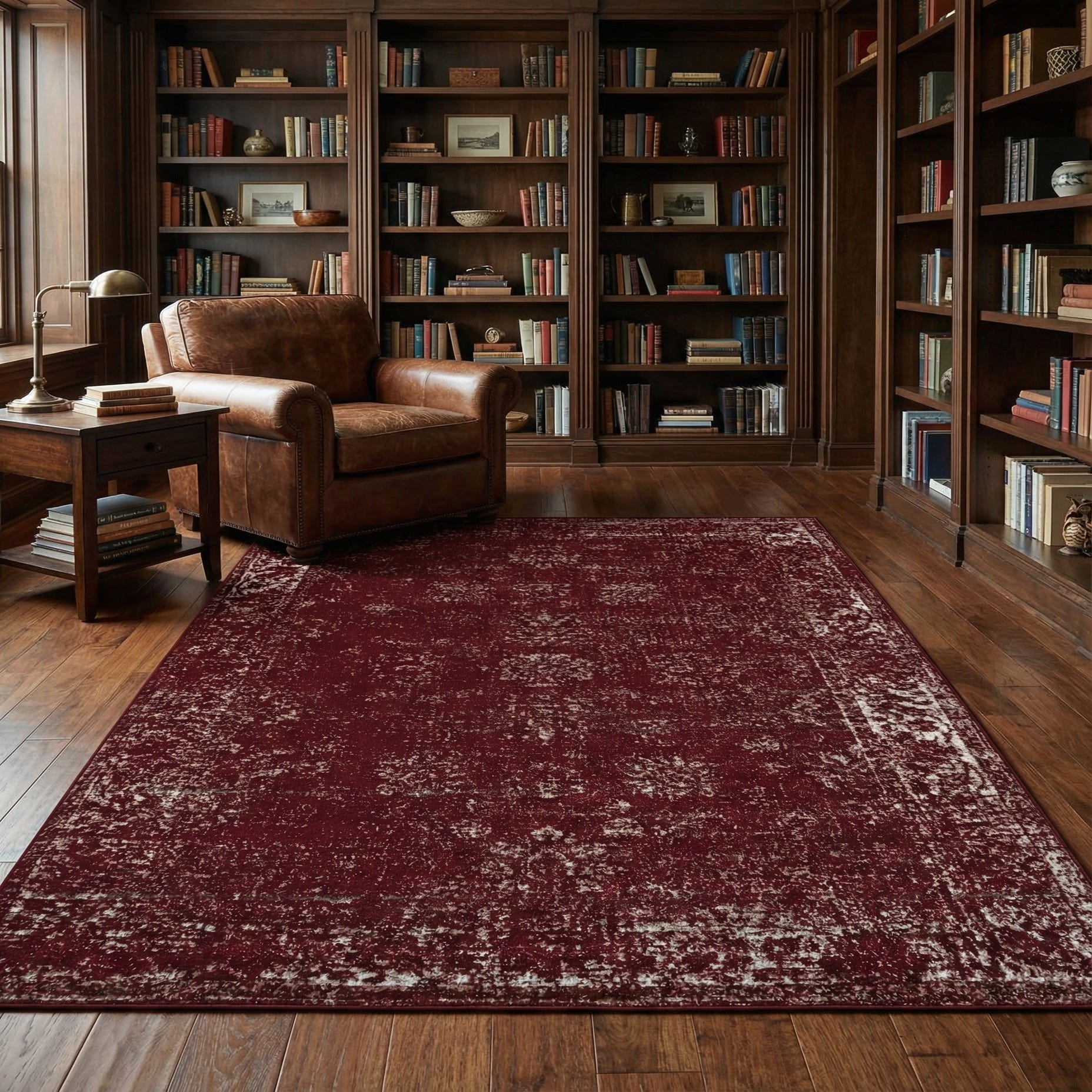 Primary color is Burgundy. Colors in this rug include: Burgundy, Gray, Ivory.
