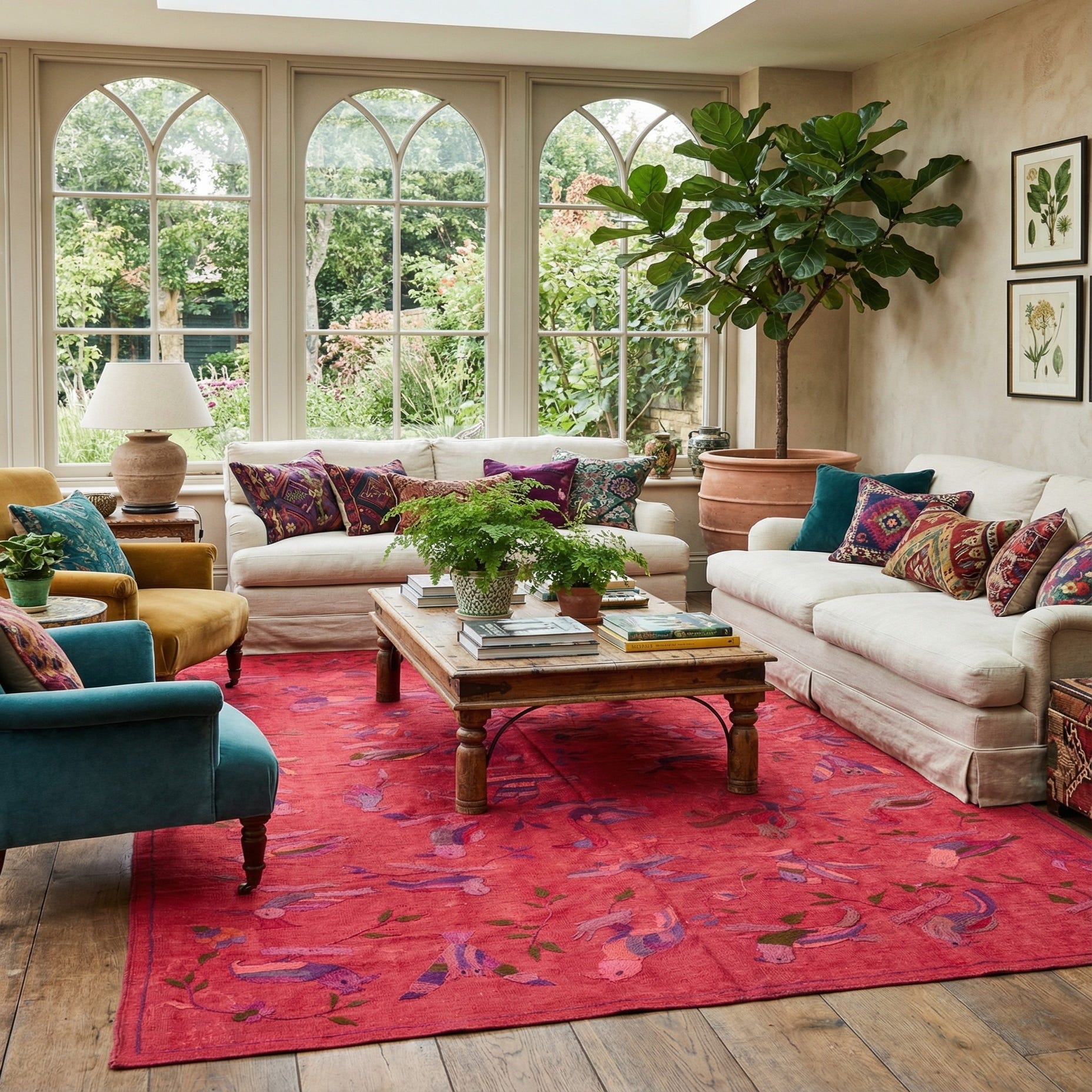 Primary color is Burgundy. Colors in this rug include: Burgundy, Red, Purple, Pink, Violet, Brown.