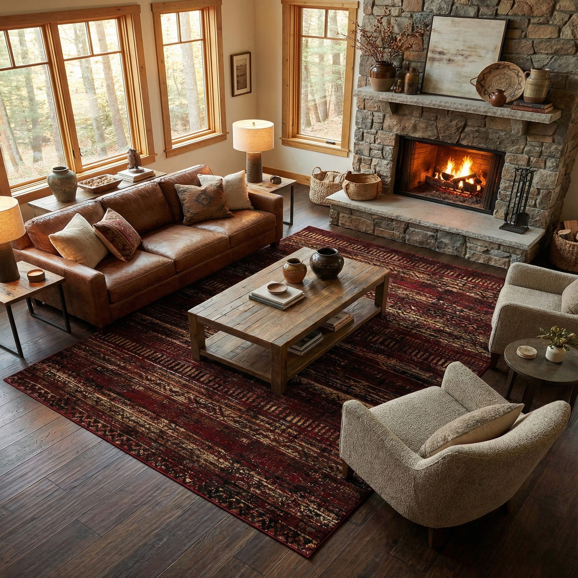 Primary color is Burgundy. Colors in this rug include: Burgundy, Beige, Black, Brown, Light Brown, Maroon.