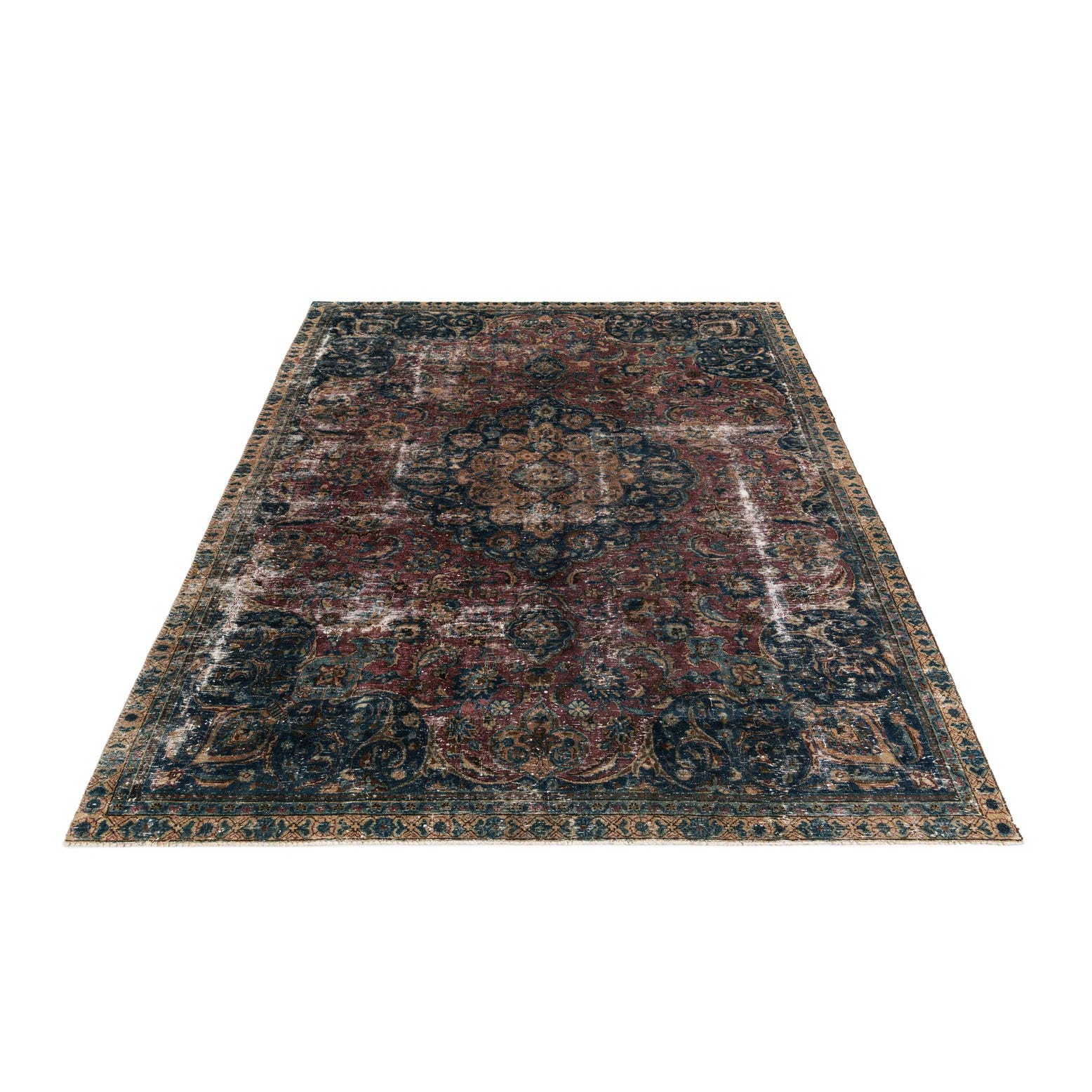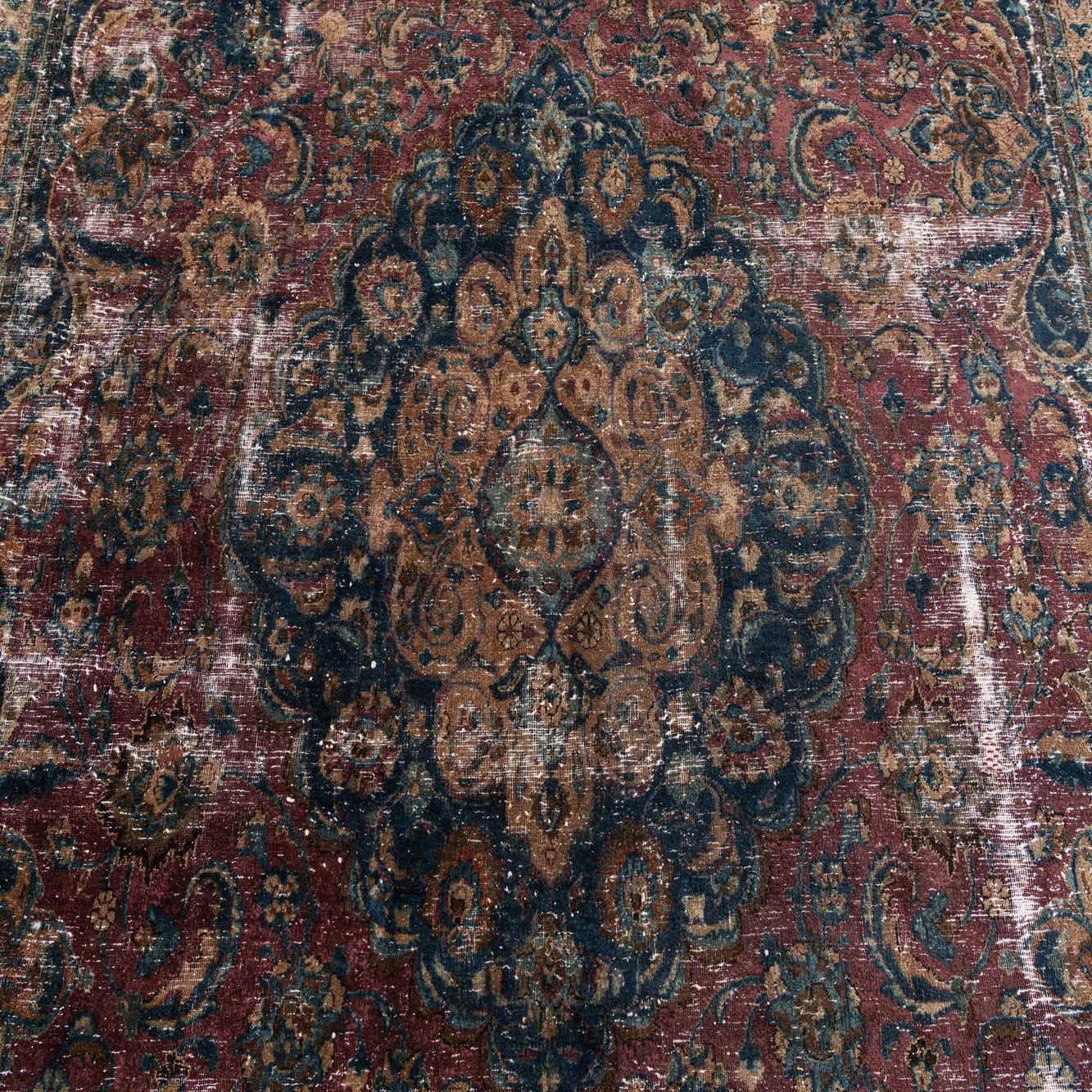 This Persian Ultra Vintage rug is an antique Persian Rug that has been washed, over-dyed, and then shaved down to a low pile. Look at the detail pictures to fully appreciate the uniqueness of this piece.