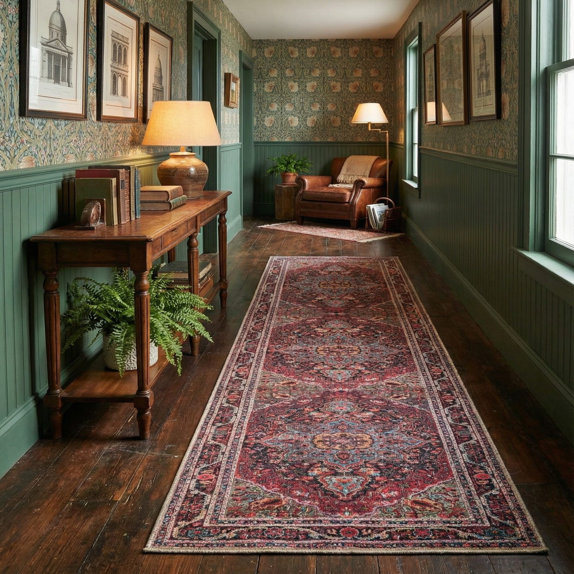 Primary color is Burgundy. Colors in this rug include: Burgundy, Beige, Black, Blue, Brown, Green, Ivory, Yellow.
